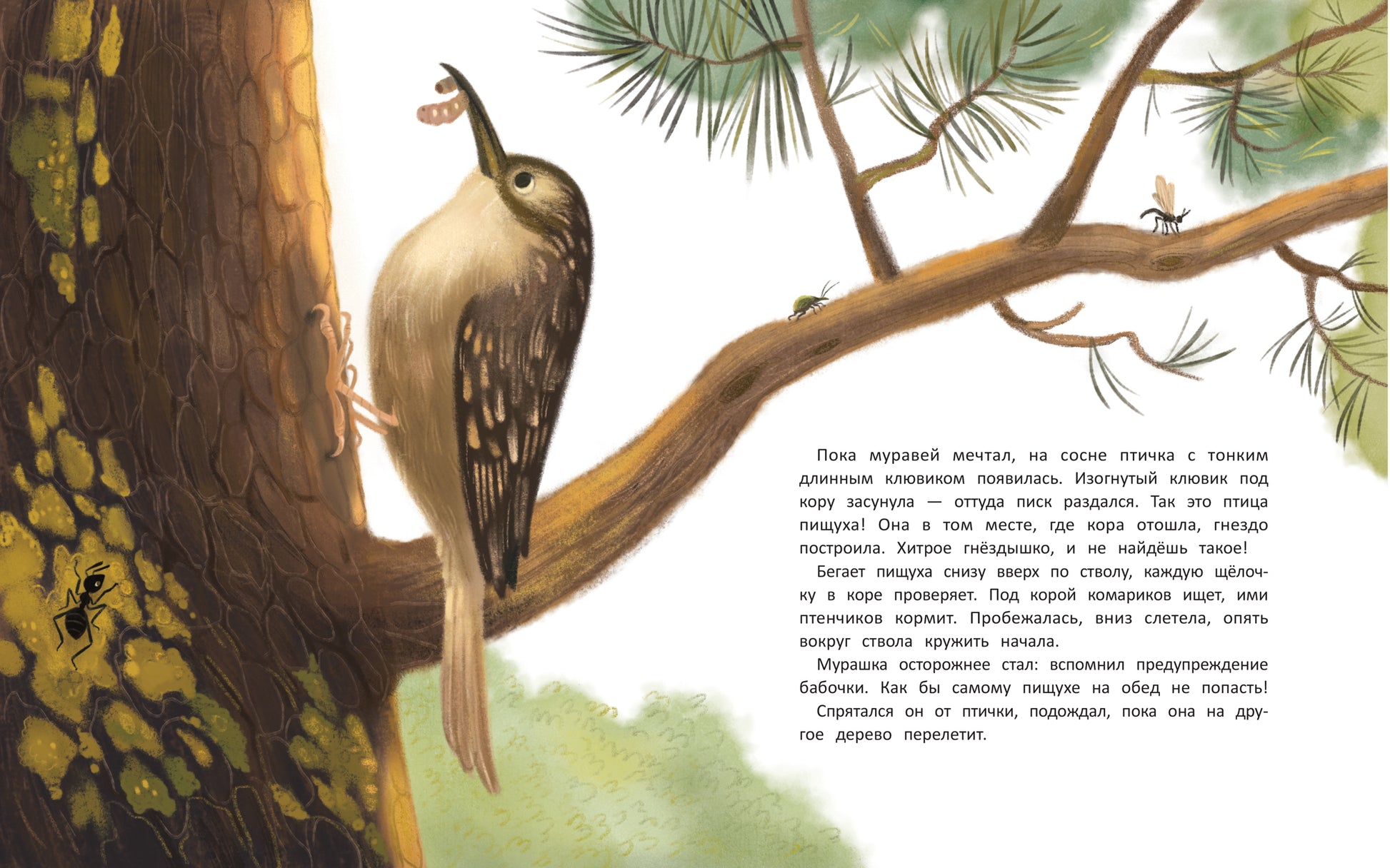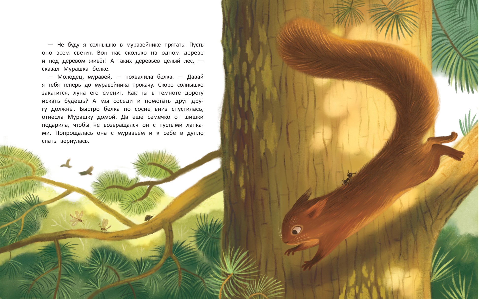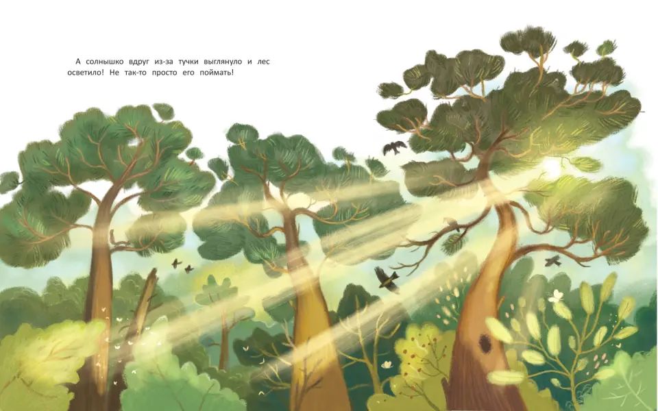 Handling time: 19 days Обитатели муравейника трудятся, вносят вклад в обустройство жилища. Вот и муравьишка решил совершить доброе дело: забраться на сосну и достать солнце, чтобы оно освещало и грело муравейник. Муравьишка отправляется в интересное путешествие и знакомится с разными насекомыми, птицами и зверями, для которых дерево стало домом: ящерицей, соней, совой, белкой, дятлом, бабочкой-бражником, жуком-усачом, пищухой, стрекозой, дроздом и другими. А добежав до макушки сосны, муравьишка понимает, что солнце в муравейник забирать неправильно: пусть оно греет каждое деревце, ставшее домом для многих животных.