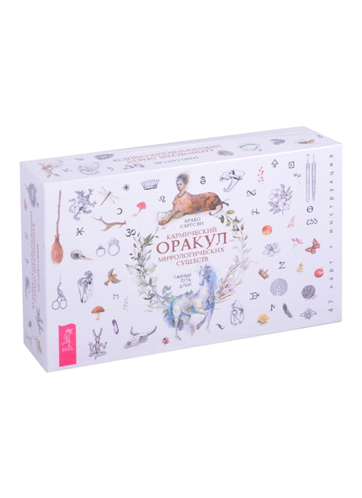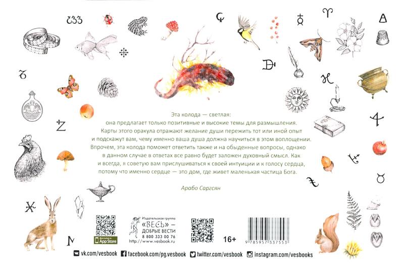 В этой уникальной колоде вы встретитесь с мифологическими существами из разных культур и времен - с ангелами и ведьмами, гномами и нимфами, грифонами и оборотнями, единорогами, драконами и вампирами. Но главная цель этого оракула в том, чтобы изучить самое загадочное из волшебных существ - вашу собственную душу.Какова цель человеческой души? Зачем она перерождается? Как прошлое влияет на настоящее и будущее развитие души? И, наверное, самый интригующий вопрос: кем мы были в прошлых воплощениях и чем занимались? Карты подскажут, на каком духовном уровне вы находитесь в настоящее время, какие кармические задачи призваны решить и куда это может вас привести. Медитации, ритуалы и авторские расклады помогут войти в контакт с картами и развить в себе те или иные духовные качества."Эта колода - светлая: она предлагает только позитивные и высокие темы для размышления. Карты этого оракула отражают желание души пережить тот или иной опыт и подскажут вам, чему именно ваша душа должна научиться в этом воплощении. Впрочем, эта колода поможет ответить также и на обыденные вопросы, однако и в данном случае в ответах все равно будет заложен духовный смысл. Как и всегда, я советую вам прислушиваться к своей интуиции и к голосу сердца, потому что именно сердце - это дом, где живет маленькая частица Бога".Арабо Саргсян.В наборе 47 карт и брошюра (256 страниц).