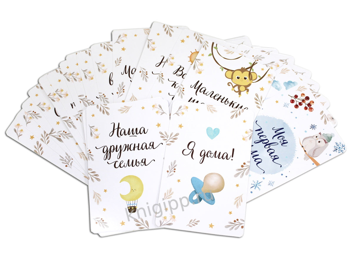 Перед вами набор карточек для фотосессии с малышом. С их помощью вы сможете запечатлеть значимые события в жизни вашего крохи, например первую прогулку, появление зубика или любимую игрушку, зафиксировать его рост и развитие по месяцам. В наборе 30 двусторонних карточек — 12 карточек по месяцам и 18 карточек для разнообразных фотосессий.