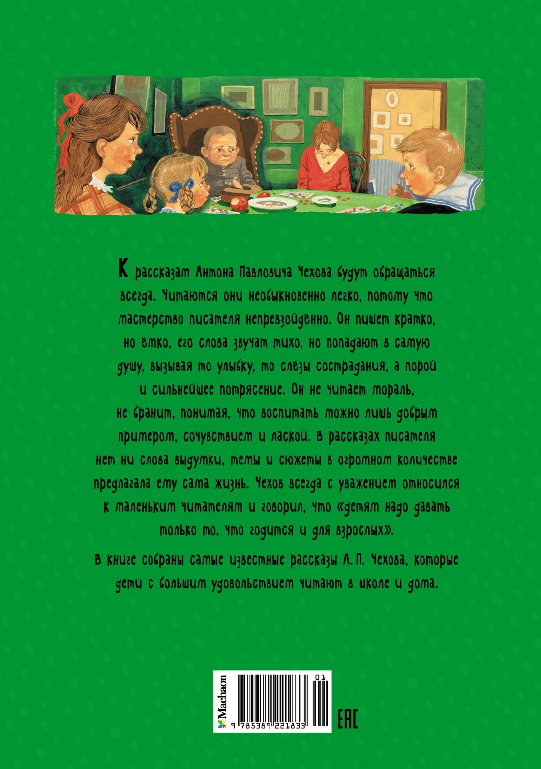 Handling time: 14 days В книге собраны самые известные и любимые рассказы А. П. Чехова. В них юмор сочетается с грустью и состраданием. Простые и тихие слова точнее всего отражают суть, попадают в самое сердце. Писатель не читает мораль и не бранит. Он понимает, что победить можно только смехом, добрым примером и сочувствием.Для детей младшего школьного возраста. Пять причин купить 1Сборник классика мировой литературы, которого не только в России, но и во многих других странах любят за особый юмор и остроумие, которые прослеживаются в каждом произведении. 2Как сказал сам автор: «Краткость - сестра таланта», поэтому тратить большое количество времени на прочтение его рассказов точно не придется. 3Чехов умеет заинтересовать и удержать аудиторию любого возраста, поэтому произведения, собранные в книге, не оставят равнодушным как ребенка, так и взрослого. 4Книга научит с иронией подходить к непростым жизненным ситуациям, сохранять позитивный настрой и не опускать руки, даже когда кажется, что выхода нет. 5Произведения написаны живым языком: легко проникнуться происходящим и заставить работать собственное воображение.