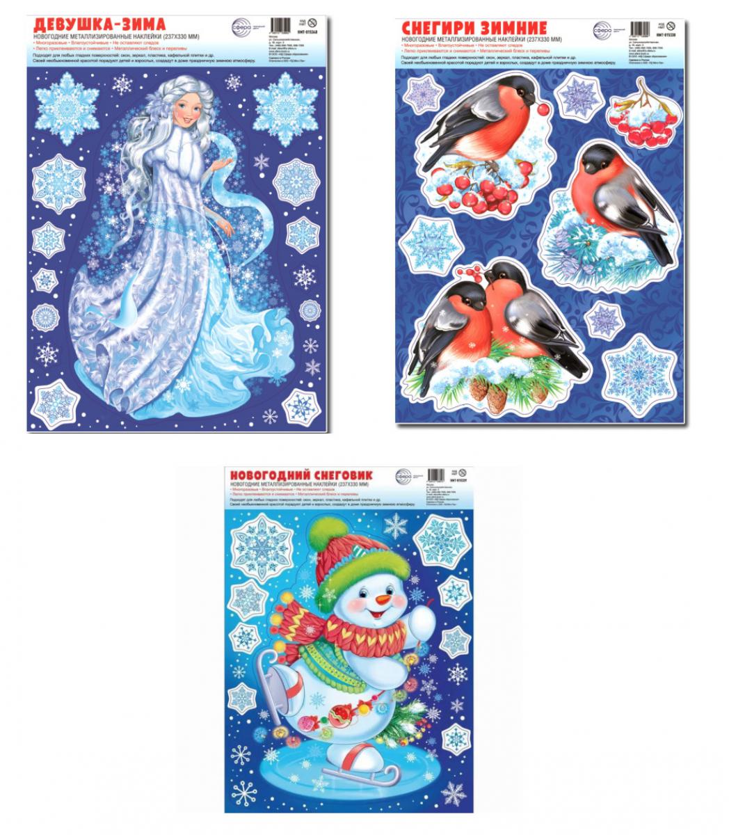 Handling time: 19 days Чудесные украшения помогут сделать любой интерьер интересным, создать уют и праздничную зимнюю атмосферу. Они несомненно порадуют и детей, и взрослых. Многоразовые наклейки легко приклеиваются и снимаются, не оставляя следов на любых гладких поверхностях — окнах, зеркалах, пластике, кафельной плитке и др. В комплект входят 3 новогодние наклейки формата А4+ с серебряной металлизацией. Полный состав: — НМТ-15338 Новогодние наклейки на окна А4+. Снегири зимние (серебряная металлизация, многоразовые) — НМТ-15339 Новогодние наклейки на окна А4+. Новогодний Снеговик. Серебряная металлизация, многоразовые) — НМТ-15340 Новогодние наклейки на окна А4+. Девушка-Зима (cеребряная металлизация, многоразовые) Возможны незначительные изменения состава комплекта.