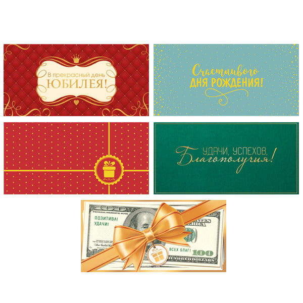 Handling time: 24 days Комплект состоит из 5-ти видов конвертов на склейке, украшенных отделкой из золотой фольги: — КДС2-16027 Конверт для денег на склейке. Счастливого Дня рождения! (золотая фольга) — КДС2-17160 Конверт для денег на склейке. 100 Долларов. Позитива! Удачи! Всех благ! (фольга) — КДС2-16056 Конверт для денег на склейке. В прекрасный день Юбилея! (золотая фольга) — КДС2-17121 Конверт для денег на склейке. Удачи, успехов, благополучия! (золотая фольга) — КДС2-16036 Конверт для денег на склейке. Без надписи (золотая фольга) В составе комплекта возможны незначительные изменения.