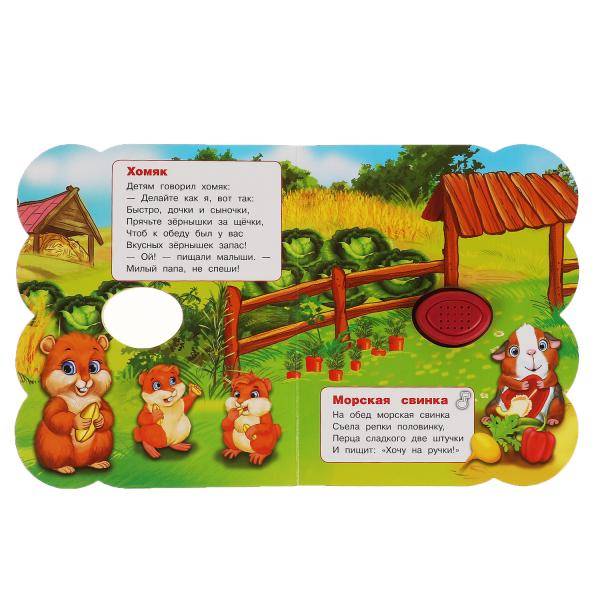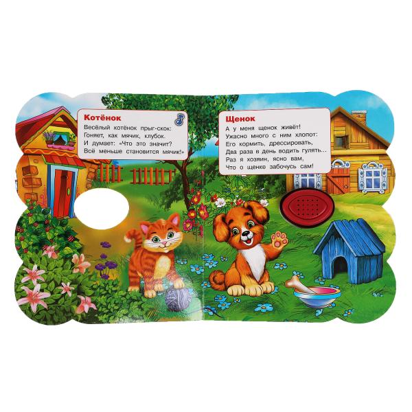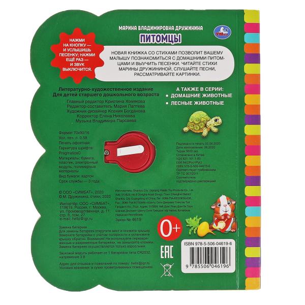 Handling time: 24 days Музыкальная книга EVA «М. Дружинина. Питомцы» ТМ «УМка» - отличный подарок для малыша:- 1 звуковая кнопка-носик- 3 озвученные в виде песенок стиха: «Котёнок», «Рыбки», «Морская свинка»- яркие иллюстрации- фигурная вырубка- мягкая окантовкаРебёнок с