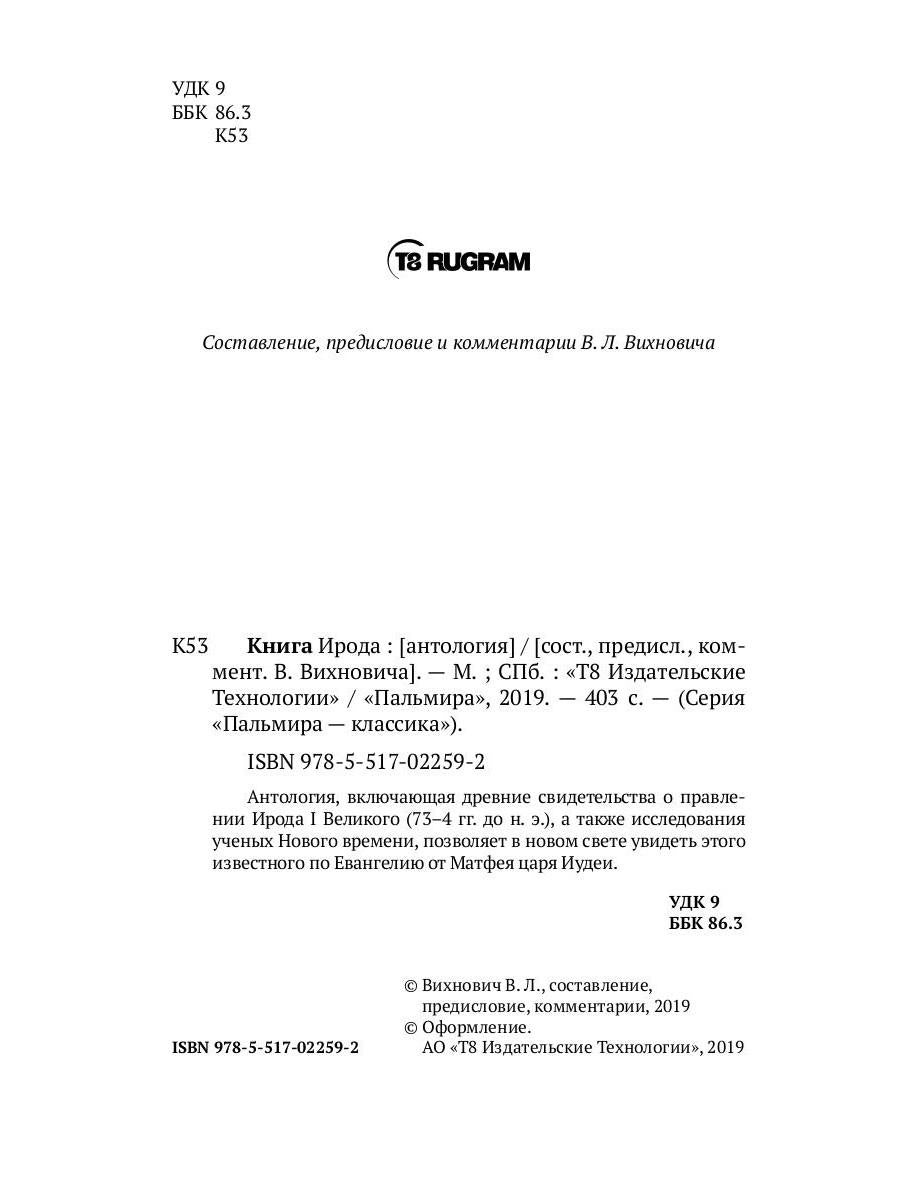 Handling time: 14 days Аннотация к книге "Книга Ирода: антология":Антология, включающая древние свидетельства о правлении Ирода I Великого (73-4 гг. до н.э.), а также исследования ученых Нового времени, позволяет в новом свете увидеть этого известного по Евангелию от Матфея царя Иудеи. Читать дальше…