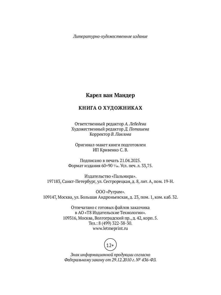 Handling time: 14 days Автор: Мандер К. ван, «Книга о художниках»: Нидерландский художник Карел ван Мандер (1548–1606) явился воплощением идеалов ренессансного гуманизма: он создавал фрески, картины, алтарные композиции, изучал античную философию, перевел «Илиаду» Гомера и поэмы Вергилия, написал целый ряд оригинальных сочинений. На исходе лет Мандер посвятил себя созданию еще одного труда, органично соединившего его интеллектуальную эрудицию, опыт писателя и живописца. Им стала «Книга о художниках» («Het Schilder-Boeck», 1604) — первый искусствоведческий труд в Северной Европе. Предназначая книгу для своих учеников, автор снабдил ее пространным дидактическим введением, комментарием к «Метаморфозам» Овидия — популярному в то время источнику художественных сюжетов, а также обзором античной иконографии. Несравненную ценность для потомков обрела основная часть его труда — уникальный свод жизнеописаний известных художников. При его составлении художник во многом опирался на известные «Жизнеописания...» Вазари, однако достиг невероятной обстоятельности и широты охвата в разделе, посвященном нидерландским и немецким живописцам, включая Яна ван Эйка, Луку Лейденского, Абрахама Блумарта, Иоахима Эйтевала, а также Питера Брейгеля Старшего и Маттиаса Грюневальда, сведения о которых отсутствуют в других источниках. Переведенная на многие языки, многократно переиздававшаяся на протяжении четырех столетий «Книга о художниках» и сегодня продолжает служить бесценным источником для изучения искусства Северного Возрождения.