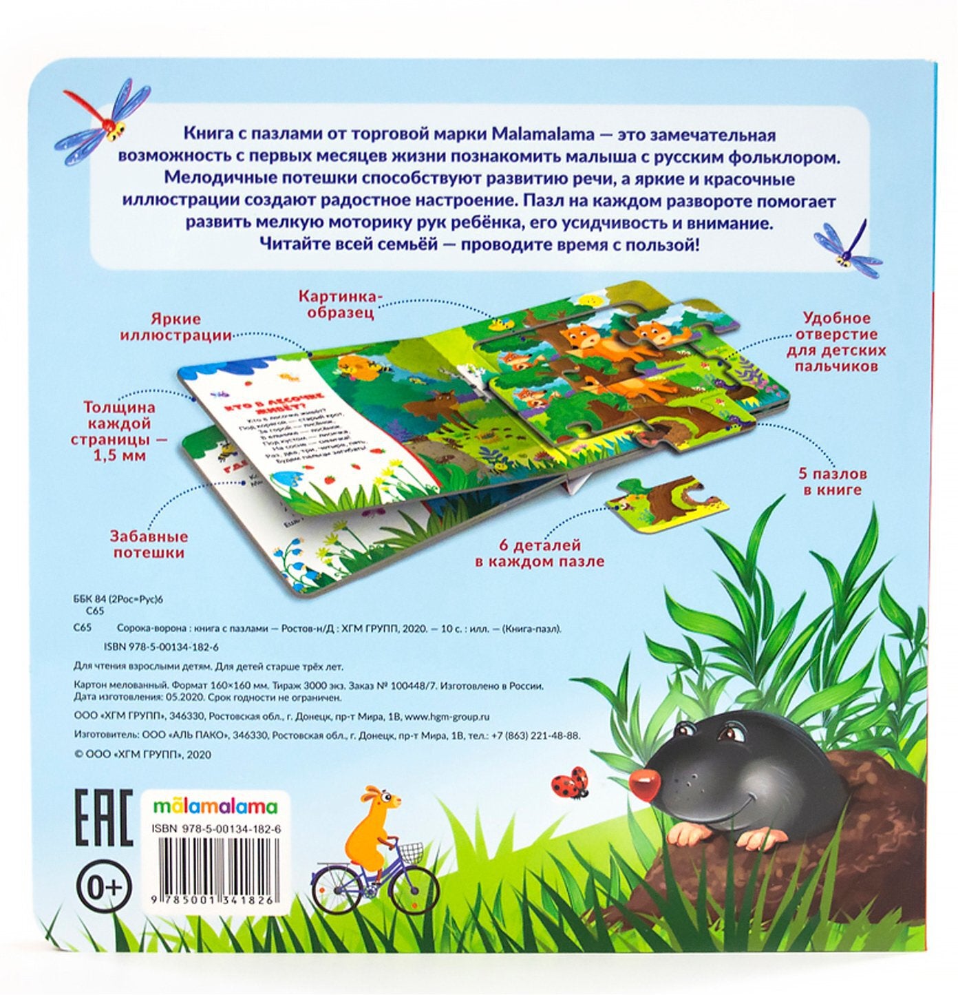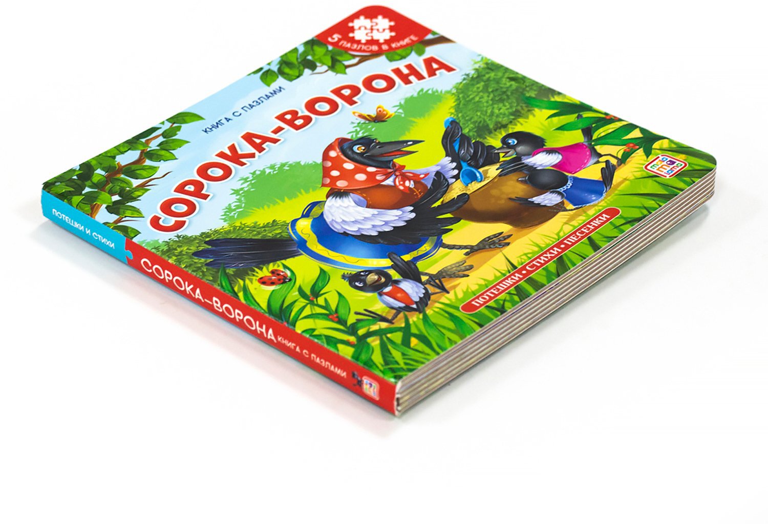 Handling time: 14 days Книга-пазл. Сорока-ворона Книга-пазл - это первое знакомство с детской литературой в игровой форме! Благодаря этой серии книг, ребёнок выучит стихи и потешки, прочитает поучительные рассказы, разучит забавные песенки, а ещё соберёт красочный пазл на каждом развороте. В книге - 5 пазлов , в каждом пазле - 6 крупных деталей, под пазлами - яркие картинки с подсказками. Удобная выемка для детских пальчиков поможет ребёнку легко научиться самостоятельно собирать пазл, а так же дополнительно развить мелкую моторику рук, логику и воображение. Страницы...