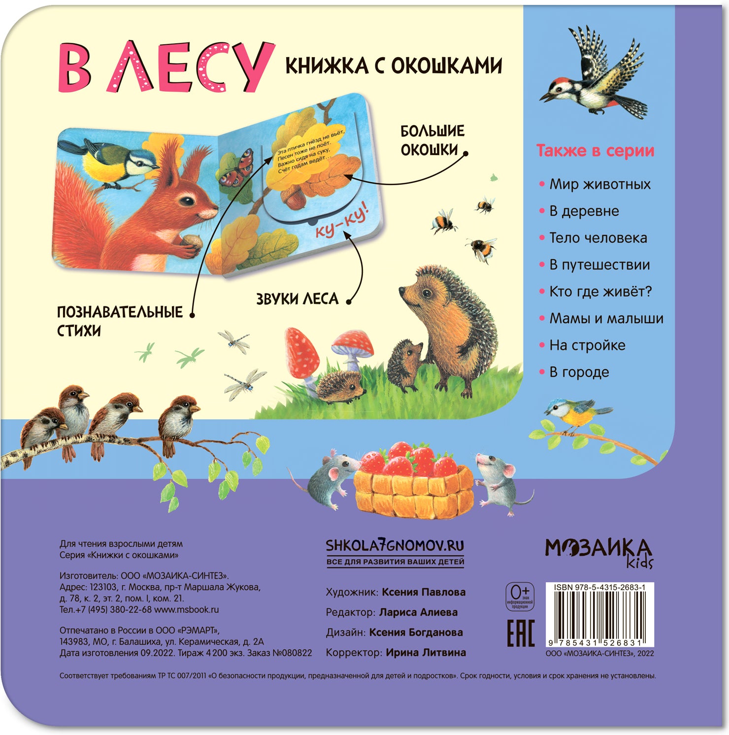 Handling time: 19 days В лесу (Книжки с окошками) Книжка с окошками «В лесу» познакомит ребенка с обитателями леса. На каждом развороте — загадка и одно большое окошко: под ними прячется картинка-отгадка. Детализированные иллюстрации Ксении Павловой интересно рассматривать даже самым юным читателям. А звукоподражание поможет ребенку в развитии речи и слуха.