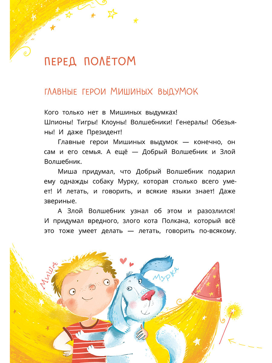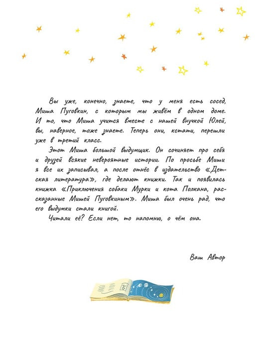 Handling time: 19 days Третьеклассник Миша Пуговкин вечно попадает в такие приключения, от которых голова идёт кругом! Накануне Дня космонавтики мальчик узнаёт, что небесные созвездия взТретьеклассник Миша Пуговкин вечно попадает в такие приключения, от которых голова идёт кругом! Накануне Дня космонавтики мальчик узнаёт, что небесные созвездия взбунтовались и не разрешают земным ракетам по космосу летать. А всё из-за космического мусора — он всем порядком надоел!Вот и застряла на Луне научная экспедиция, не может вернуться на родную Землю.Кто сумеет помирить людей с созвездиями? Конечно он, Миша Пуговкин, и его верные друзья — собака Мурка и кот Полкан! А ещё — вечный космонавт планеты Земля Юрий Гагарин, вместе с которым они отправятся в настоящее межзвёздное путешествие!бунтовались и не разрешают земным ракетам по космосу летать. А всё из-за космического мусора — он всем порядком надоел!Вот и застряла на Луне научная экспедиция, не может вернуться на родную Землю.Кто сумеет помирить людей с созвездиями? Конечно он, Миша Пуговкин, и его верные друзья — собака Мурка и кот Полкан! А ещё — вечный космонавт планеты Земля Юрий Гагарин, вместе с которым они отправятся в настоящее межзвёздное путешествие!