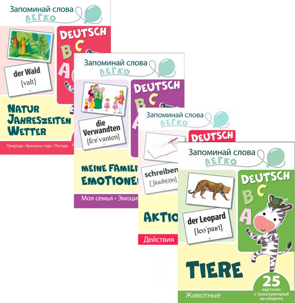 Комплект состоит из: Запоминай слова легко. Животные (немецкий). 25 карточек с транскрипцией на обороте Запоминай слова легко. Действия (немецкий). 25 карточек с транскрипцией на обороте Запоминай слова легко. Моя семья. Эмоции (немец.). 25 карточек с транскрипцией на обороте Запоминай слова легко. Природа. Времена года. Погода (немец.). 25 карточек с транскрипц.