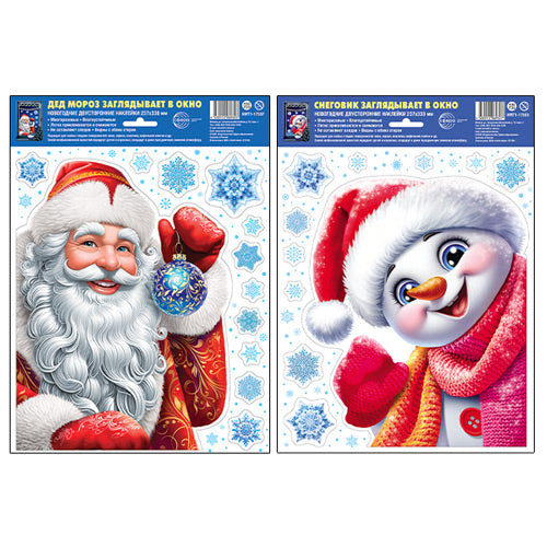 *КБН-17761 Комплект новогодних наклеек А4+. Дед Мороз и Снеговик заглядывают в гости-1 (2 наклейки, видны с обеих сторон, многоразовые)