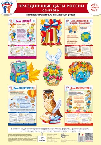 Комплект состоит из четырех плакатов, приуроченных к сентябрьским праздникам, которые отмечаются в дошкольных организациях и школе: «День знаний», «День солидарности в борьбе с терроризмом», «День грамотности», «День воспитателя», четырех сценариев занятий к каждому празднику и вырубных фигур, необходимых для игровой деятельности или оформления помещений к данным праздникам.