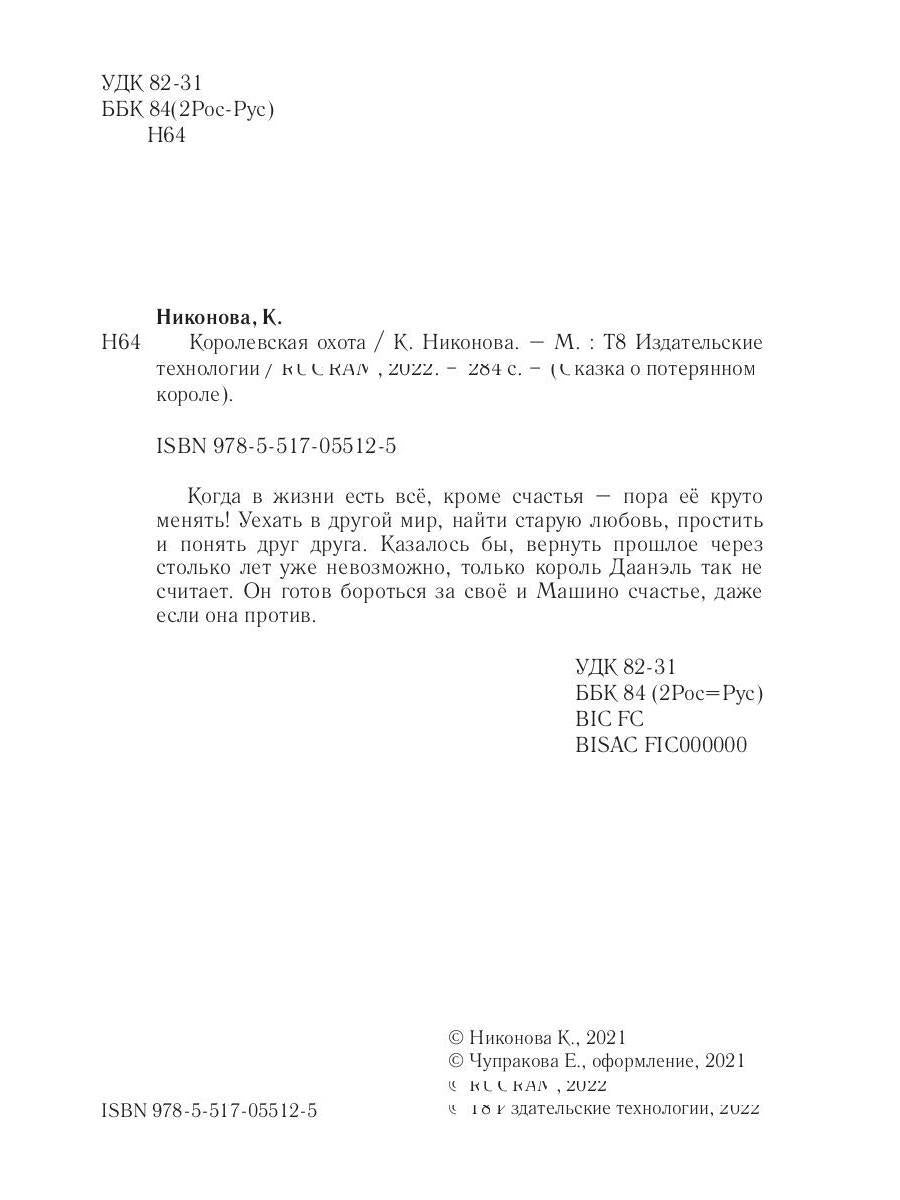 Handling time: 19 days Автор: Никонова Ксения, «Королевская охота. Книга 3»: Когда в жизни есть всё, кроме счастья — пора её круто менять! Уехать в другой мир, найти старую любовь, простить и понять друг друга. Казалось бы, вернуть прошлое через столько лет уже невозможно, только король Даанэль так не считает. Он готов бороться за своё и Машино счастье, даже если она против.