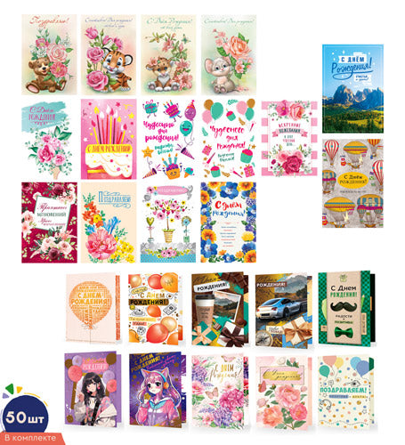 *КО-17081 Комплект открыток среднего формата. С Днем рождения!-2 (50 шт.: 25 видов по 2 шт)/ Синтега