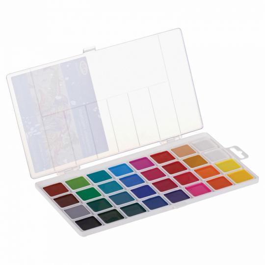 Краски акварельные медовые, полусухие (без кисти).Медовая акварель в обновленной подложке: больший объем краски в кюветах - больше возможностей для творчества. Благодаря качественному прозрачному связующему в составе, цвета акварели яркие и чистые.Краски акварельные медовые, полусухие.Увеличенное расстояние между кюветами, чтобы краски не смешивались во время рисования. Если нужно получить новый оттенок, на крышке предусмотрена палитра. Отделение для кисти с удобными зонами захвата - ребенок сможет быстро достать кисть, не переворачивая подложку. Удобный замок и прочные петли плотно фиксируют крышку.Самый большой набор акварели серии "Классическая".В наборе 2 кюветы с белой краской.Объем кюветы - 3,14 см3.Не предназначено для детей младше 3-х лет.Сделано в России.