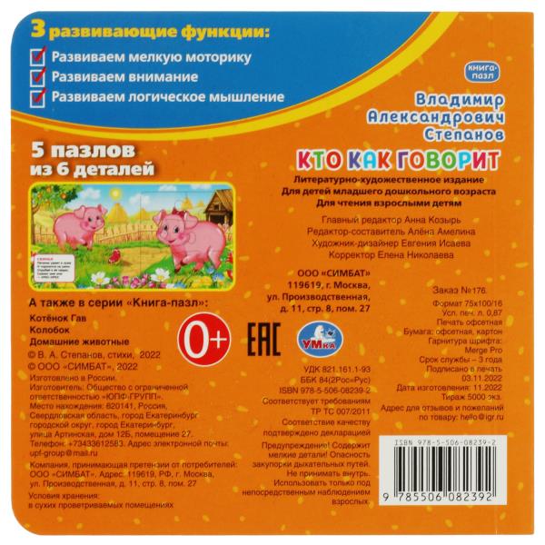 Handling time: 14 days Книга "Кто как говорит. В.Степанов. Книга с 5 пазлами. 160х160мм. 10 карт. стр. Умка в кор.28шт". Издательство: М. : Издательский дом "УМКА". Год выпуска: 2023. Переплет: Твердый переплет. Количество страниц: 10. Автор: В. А. Степанов. Стандарт: 28.