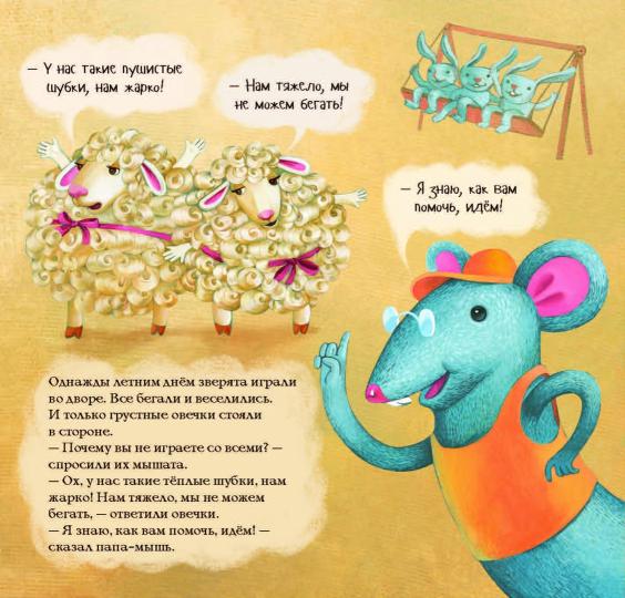 Однажды летним днём зверята играли во дворе. Все бегали и веселились.И только грустные овечки стояли в стороне.- Почему вы не играете со всеми? - спросили их мышата.- Ох, у нас такие тёплые шубки, нам жарко! Нам тяжело, мы не можем бегать, - ответили овечки.- Я знаю, как вам помочь, идём! - сказал папа-мышь...Новая серия забавных познавательных историй от Светланы Татарниковой для самых маленьких. Дети вместе с любознательными мышатами узнают много всего нового и найдут ответы на разные интересные вопросы. Откуда берётся сыр? Как появляется шерсть? И сколько всего удивительного должно произойти, чтобы мы могли приготовить самое простое печенье? Читайте скорее!Для чтения взрослыми детям.