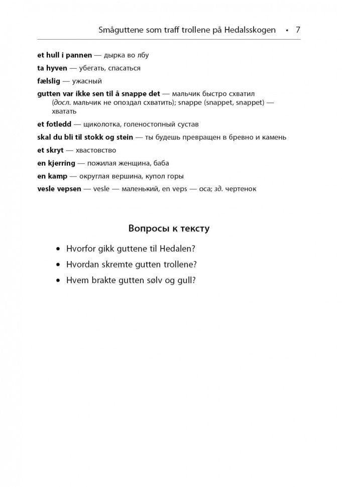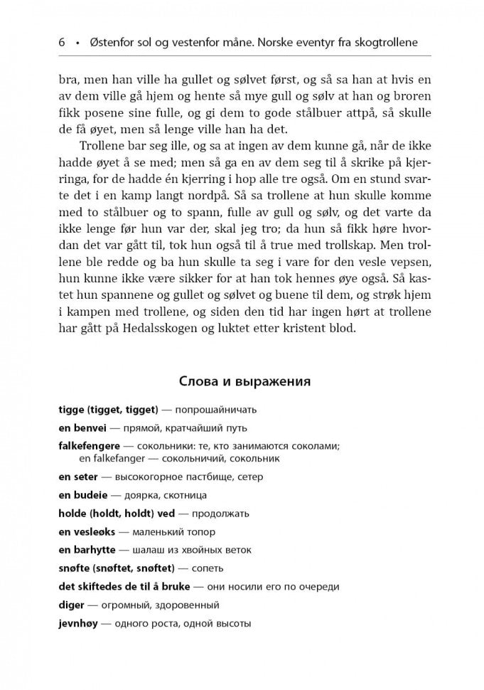Handling time: 25 days В сборнике десять оригинальных норвежских сказок. Сказки невероятно атмосферные, наполненные запахом моря, шепотом листьев и отблесками неяркого северного солнца. Каждую сказку сопровождают стильные иллюстрации. Среди сказок есть и хорошо знакомые русскому читателю: "К востоку от солнца и к западу от луны", "Замок Сориа-Мориа", "Мальчики, которые встретили троллей в Хедальском лесу" - и неизвестные, ранее не переводившиеся, например "Седьмой отец в доме". В книге тексты сказок на норвежском языке дополняют их художественные переводы на русский язык. Вопросы к текстам, а также слова и выражения к ним помогут читателю яснее понять содержание сказки, закрепить в памяти распространенные грамматические формы и пополнить словарный запас. Пособие предназначено для всех, кто изучает норвежский язык самостоятельно или с преподавателем. Средний уровень / Mellomnivå - неадаптированный текст - перевод на русский язык - упражнения и словарь - интересные сюжеты - оригинальные иллюстрации норвежский язык/чтение на норвежском/норвежский для детей/художественная литература на норвежском языке/адаптированное чтение на норвежском/чтение на норвежском с переводом