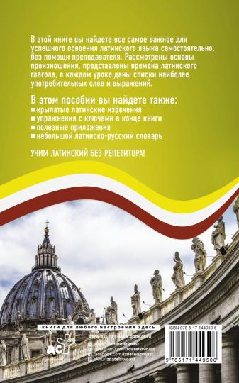 Handling time: 14 days Данный самоучитель поможет читателям самостоятельно без помощи преподавателя овладеть азами латинского языка. В этой книге вы найдете правила чтения и произношения, самые нужные грамматические темы, а также узнаете основные латинские времена. Материал в пособии изложен максимально понятно и доступно, хорошо запоминается благодаря большому количеству примеров с широкоупотребительной лексикой. К каждому уроку дается словарик с новыми и полезными словами, также приводятся крылатые латинские изречения. Для успешного закрепления пройденной темы даны упражнения, ключи к которым помещены в конце книги. Вы также можете воспользоваться полезными приложениями и латинско-русским словарем. Пособие предназначается для широкого круга лиц, изучающих латинский язык, и в первую очередь для тех, кто учится самостоятельно.