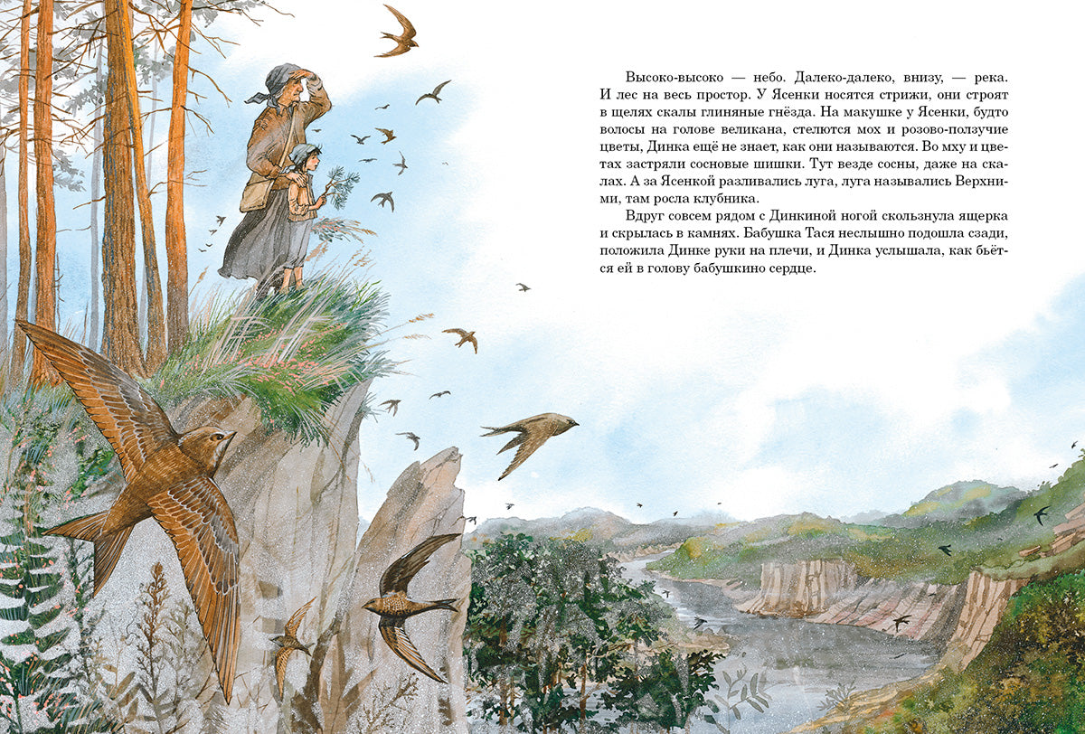В рисунках художницы Анастасии Серпреки стали настоящими и шум сосен, и ветер в Динкиных волосах, и всплеск воды в лесном озере, и, главное, — доброта величественного края и его жителей.