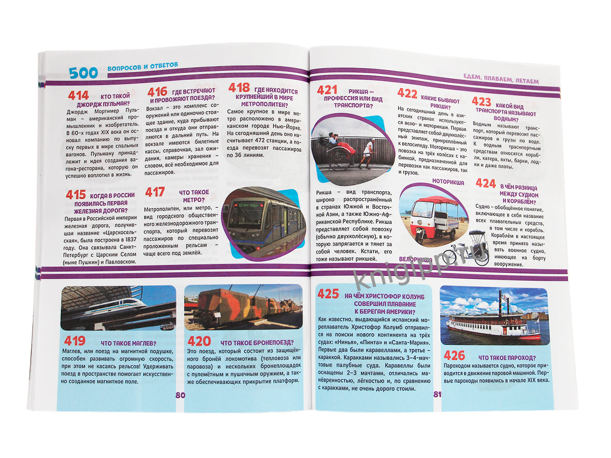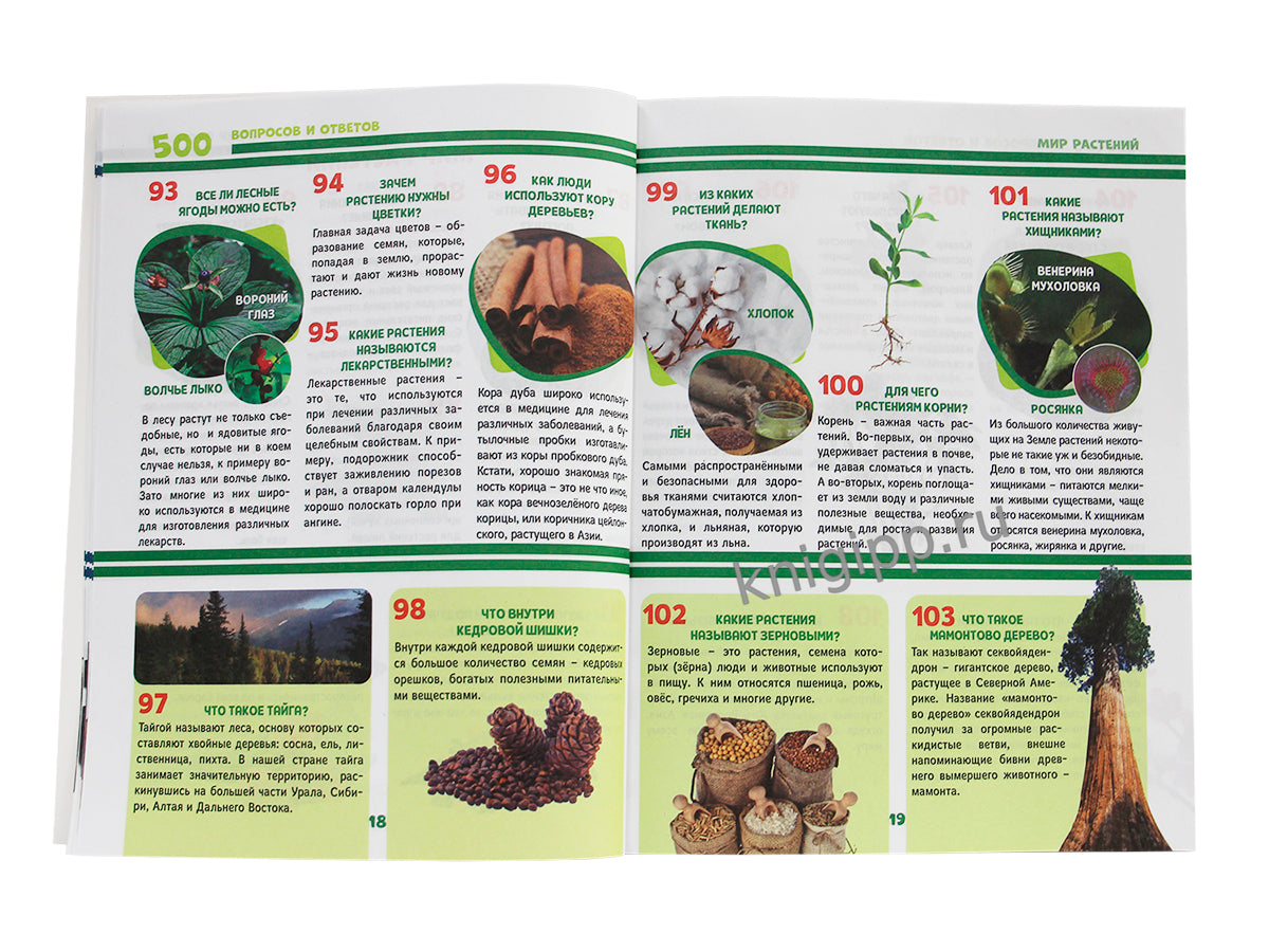 В этой энциклопедии вы найдёте 500 ответов на вопросы о животных, растениях, Земле и космосе, транспорте, кулинарии и самых интересных и загадочных местах нашей планеты.