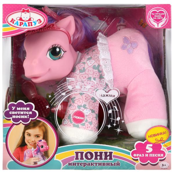 Handling time: 14 days Интерактивная игрушка «Пони» ТМ «Карапуз» - озвученная игрушка. Говорит 5 фраз и поёт песенку.Функции 4 в 1:- говорит и поёт (при нажатии на переднюю левую ножку)- светящийся носик- пьёт из бутылочки- причмокиваетАксессуары в комплекте:- бу
