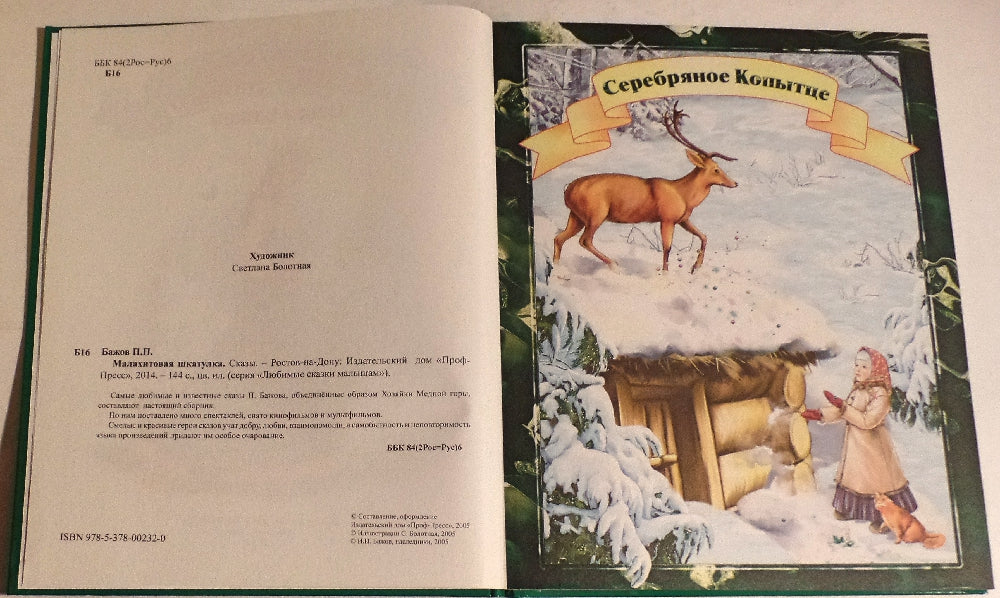 Handling time: 19 days Замечательный русский писатель и фольклорист Павел Бажов создал удивительную книгу уральских сказов "Малахитовая шкатулка". В данный сборник вошли некоторые произведения из той книги: "Серебряное копытце", "Огневушка-поскакушка", "Голубая змейка", "Каменный цветок", "Медной горы хозяйка" и "Синюшкин колодец". Старинные устные предания уральских горнорабочих нашли свое воплощение в этих произведениях, в полной мере передавших самобытный язык, жизненный уклад и неповторимую, загадочную атмосферу тех мест. Благодаря сборнику "Малахитовая шкатулка" очарование сказов Бажова коснется маленьких читателей и увлечет их в мир, в котором сосуществуют реальность и волшебство.Красочные цветные иллюстрации. Художник Светлана Болотная.Для детей дошкольного и младшего школьного возраста.