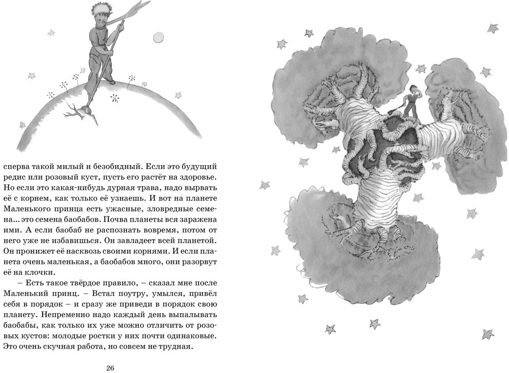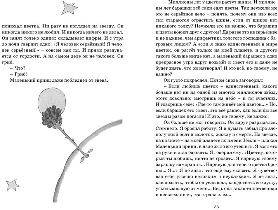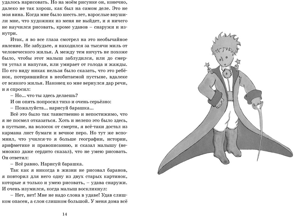 Повесть-сказка «Маленький принц» – самое известное произведение Антуана де Сент-Экзюпери. Книга впервые была опубликована в 1943 году, с тех пор переведена более чем на 300 языков, а её суммарный тираж превышает несколько десятков миллионов экземпляров. Волшебная история путешествий маленького принца к далёким планетам, история его удивительных знакомств с капризной, но очаровательной розой, мудрым Лисом, величественным королём и многими другими и по сей день не оставляет равнодушными ни детей, ни взрослых.Для среднего школьного возраста. Пять причин купить 1Самое известное произведение Антуана де Сент-Экзюпери, благодаря которому о его литературном таланте узнал весь мир. 2Книга станет находкой для любого возраста: дети увидят в ней уникальный сюжет, а взрослые - ответы на многие философские вопросы, которые приходят в голову по ночам и не дают уснуть. 3Включенные в книгу иллюстрации необычные, они выполнены самим автором и являются важнейшей частью повести, без которой прочтение покажется неполным. 4Возможность на время остановиться, забыть о каждодневной суете и на пару минут задуматься о по-настоящему важных вещах: настоящей любви, верности и дружбе. 5После прочтения появится непреодолимое желание уехать за город и долго всматриваться в ночное звездное небо.