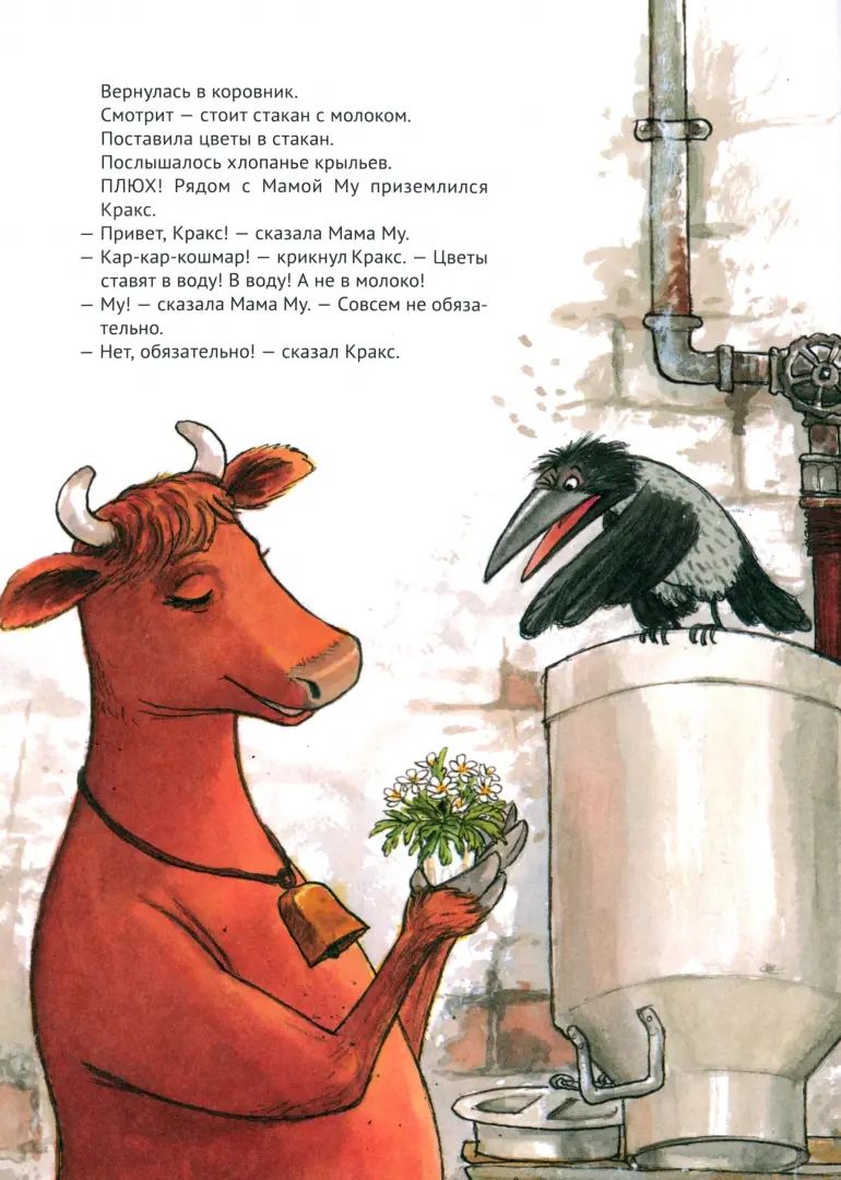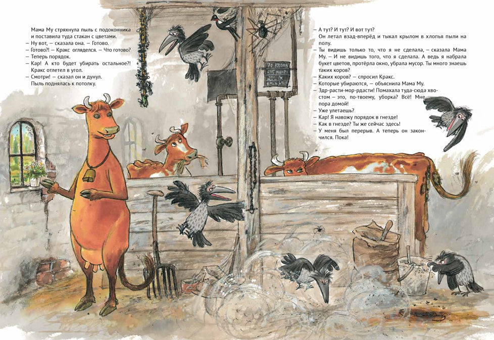 Handling time: 34 days Коровы провели в стойле всю зиму, но теперь снег растаял. Мама Му решает немного прибраться в коровнике и украсить его цветами. Ворона Кракс, глядя на нее, отправляется в свое гнездо, чтобы тоже навести порядок у себя в заваленном всякой всячиной гнезде. А потом прилетает обратно в коровник и начинает и там наводить порядок, но по-своему: сначала просто выключает свет, чтобы беспорядка не было видно, потом выдувает все сено с помощью вентилятора, наконец красит все в белый цвет...Для кого:Для совместного чтения с детьми от 3 лет.О серии:Каждая книга о Маме Му и ее друге Краксе — это забавная история о любознательной и задумчивой корове и ее друге воро́не. Герои оказываются в ситуациях, с которыми сталкиваются дети, — идут в бассейн, катаются на снегокате, учатся читать, — и познают мир вместе с читателями.Книги про Маму Му и Кракса переведены на тридцать языков и известны во всем мире. Их авторы — Юя Висландер, почетный член шведской Академии детской книги, и Свен Нурдквист, художник, получивший мировую известность благодаря книгам о Петсоне и Финдусе.Многие книги серии публикуются в России впервые. Переиздания опубликованы в новом переводе, формат книг приближен к оригиналу (такой же, как в серии о Петсоне и Финдусе). Серия регулярно пополняется новыми книгами. Компьютерные игры про Маму Му и Кракса переведены на русский язык, также существуют театральная постановка и полнометражный мультфильм.Об авторах:Свен Нурдквист родился в городе Хельсингборге. Уже в пятнадцать лет он знал, что будет художником. Поэтому, учась на архитектора, он одновременно ходил на курсы по искусству и рисованию. Поначалу Свен Нурдквист создавал иллюстрации к школьным учебникам. А от учебников недалеко и до детских книг. Работы Нурдквиста участвуют во многих международных выставках.Юя Висландер — шведская детская писательница. Наиболее известна как автор серии рассказов о любознательной корове Маме Му и философствующем вороне Краксе с иллюстрациями Свена Нурдквиста. Юя придумала персонажей вместе с мужем Томасом. Мама Му и Кракс появились как герои радиоспектакля и детских песен, и лишь в 1991 году вышла первая книга.