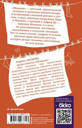Handling time: 14 days «Манюня» — светлый, пропитанный солнцем и запахами южного базара и потрясающе смешной рассказ о детстве, о двух девочках-подружках Наре и Манюне, о грозной и доброй Ба — бабушке Манюни, и о куче их родственников, постоянно попадающих в казусные ситуации. Это то самое теплое, озорное и полное веселых приключений детство, которое делает человека счастливым на всю жизнь.