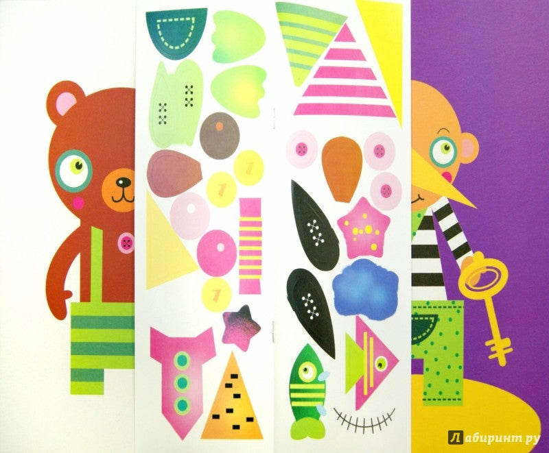 А теперь добавим ножек. И тогда получится не осьминожик, а очень оригинальная и очень симпатичная объемная картинка. Как известно, деталь во многом «делает» образ. Иногда самое простое изображение становится необычным, неповторимым, если добавить к ней какую-либо «фишку». В нашей книжке такая «изюминка» - длинные ножки. Длинноногие пират, Буратино, мишка - эти картинки порадуют и удивят и ребенка, и того, кому он захочет картинки подарить. Что вы найдете в книжке: • Четыре картинки в рамках (вкладка и обороты обложки). Они украсят детскую комнату или пригодятся в качестве подарка другу или кому-то из близких к празднику или дню рождения. • Цветной лист бумаги с бумажными полосками. Это заготовки для длинных ножек. Как их сделать, смотрите на страничке «Как сделать ножки». На этой странице поэтапно показано, как из четырех бумажных полосок сплести ножку. • Лист наклеек с деталями, которыми ребенок украсит свою картинку в рамочке. Желательно перед началом работы рассмотреть готовые картинки на страничке «Что должно получиться». Принимать наш вариант или следовать своему вкусу и использовать наклейки по-своему - дело вашего ребенка. • Два изображения без рамок на обороте вкладки. Обратите на них внимание. Они даны на случай, если ребенку не понравится наша рамка и захочется пофантазировать: сделать и украсить рамку по своему вкусу. Рамку, плоскую или объемную, из картона или фактурной бумаги, можно украсить пайетками, красивыми пуговицами, цветами, мягкой объемной бумагой, листиками, своими рисунками или надписями и т.д. Вариантов огромное множество. Сделать наши красочные панно достаточно просто. Понадобятся лишь ножницы, клей или степлер, ну и наша книжка. Все остальное зависит от фантазии вашей и вашего ребенка.