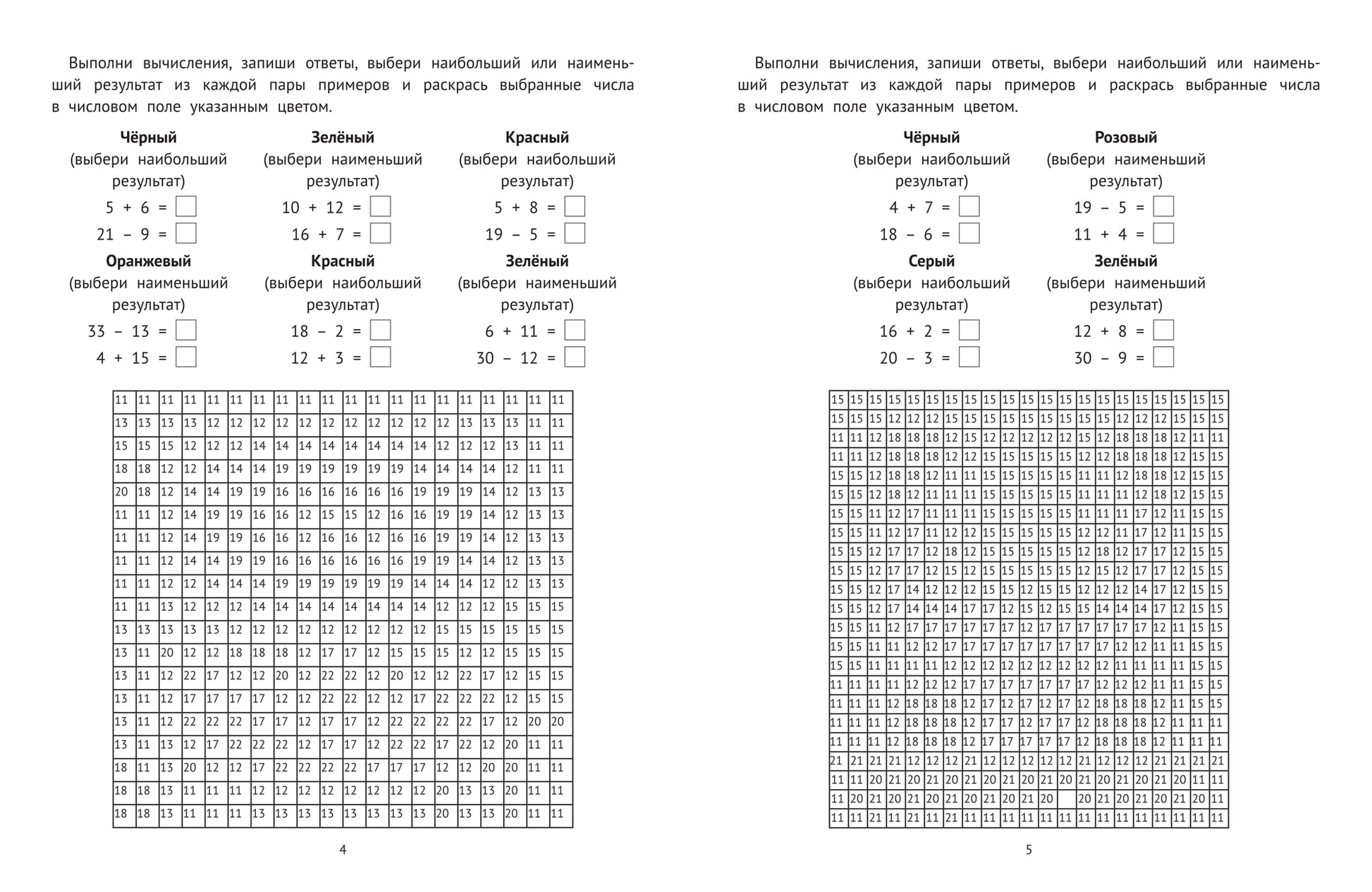Математические раскраски: больше - меньше. - Изд. 2-е На страницах этой книги собраны задания на закрепление умения сравнивать числа и находить наибольшее или наименьшее число среди полученных результатов. Дети решают примеры, записывают ответы. Затем определяют наибольшие или наименьшие числа, находят их на числовом поле и закрашивают клетки указанными цветами. Выполнение таких заданий развивает память, внимание, мелкую моторику рук. Книга предназначена для детей, родителей и учителей начальной школы.