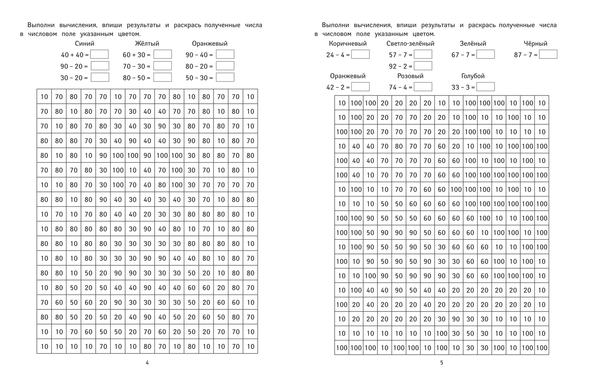 Handling time: 14 days На страницах этой книги собраны задания на закрепление случаев сложения и вычитания в пределах 100. умножения и деления двух и на два, трёх и на три. Дети решают примеры, записывают ответы. Затем находят на числовом поле полученные результаты и закрашивают клетки с числами в указанные цвета. Выполнение таких заданий развивает память, внимание, мелкую моторику рук.Книга предназначена для детей, родителей и учителей начальной школы.4-е издание.