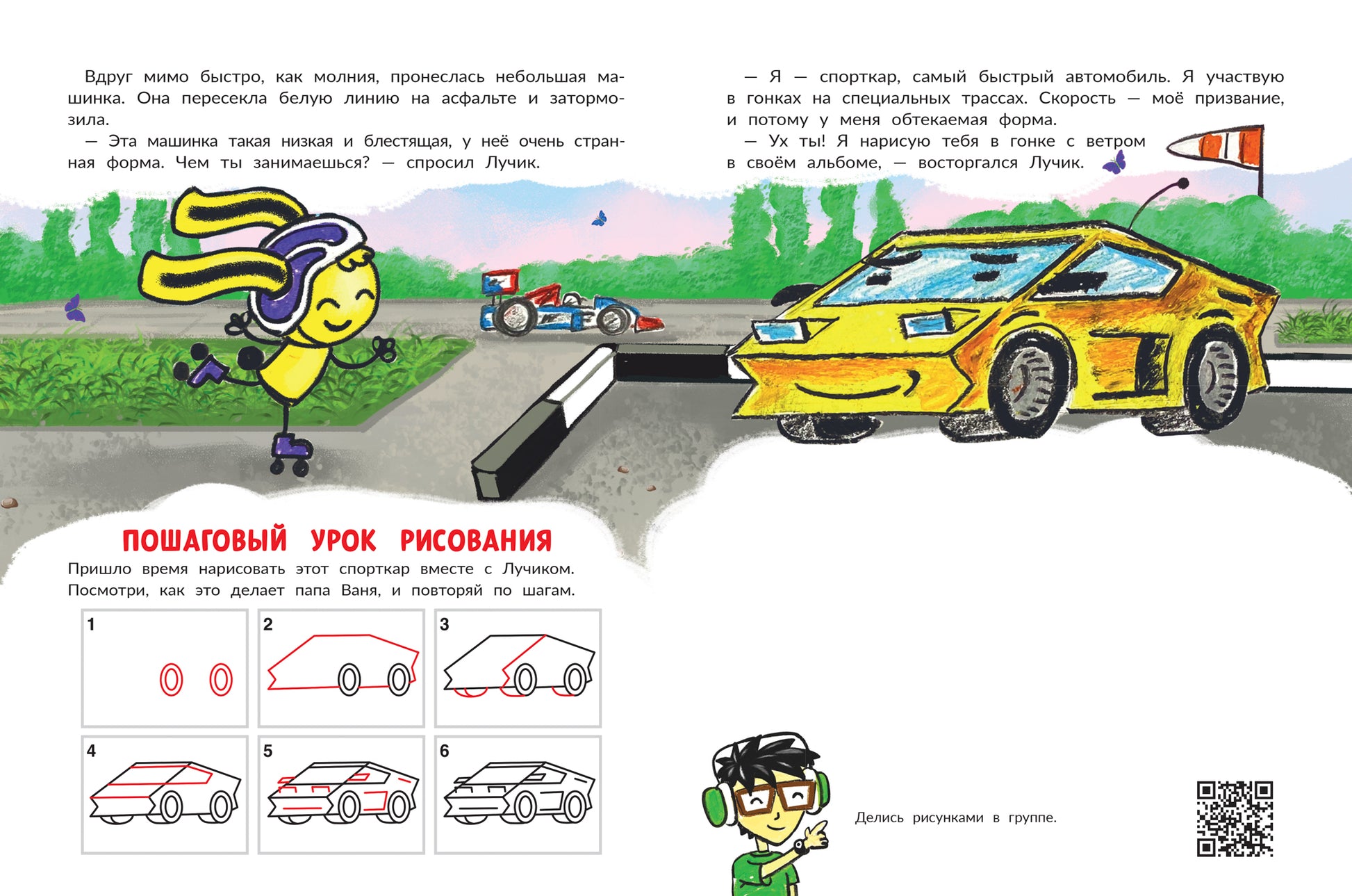 Развивающие истории от папы Вани уникальны не только своим содержанием, но и обучающими фрагментами, а также пошаговыми уроками рисования. Рисуйте вместе с автором на его канале - отсканируйте QR-код и переходите по ссылке. В этой книге вы познакомитесь с полезными машинками и их назначением, а также с правилами дорожного движения.