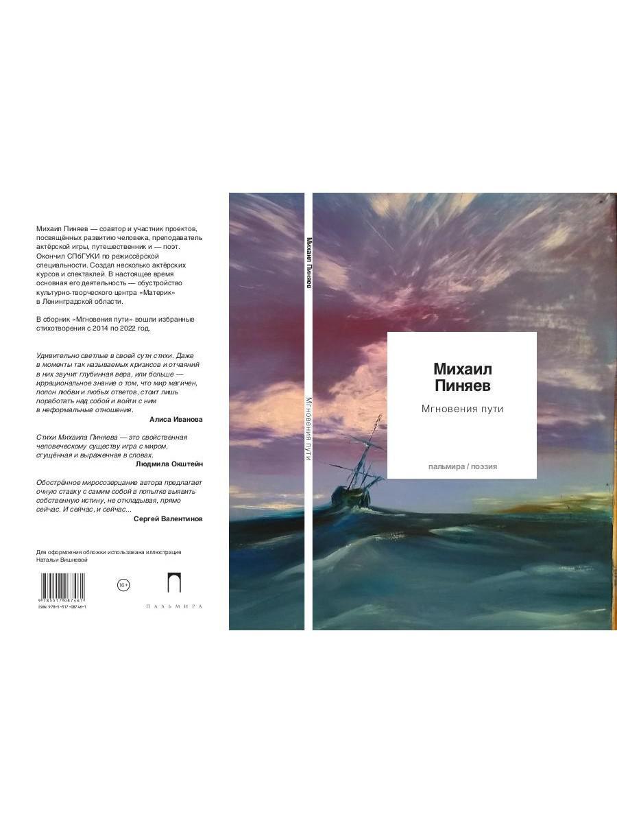 Handling time: 19 days Автор: Пиняев М.А., «Мгновения пути»: Михаил Пиняев - автор развивающих проектов, преподаватель актёрской игры, путешественник и - поэт. Окончил СПбГУКИ по режиссёрской специальности. Создал несколько актёрских курсов и спектаклей. В настоящее время основная его деятельность- обустройство культурнотворческого центра "Материк" в Ленинградской области. В сборник "Мгновения пути" вошли избранные стихотворения с 2014 по 2022 год.