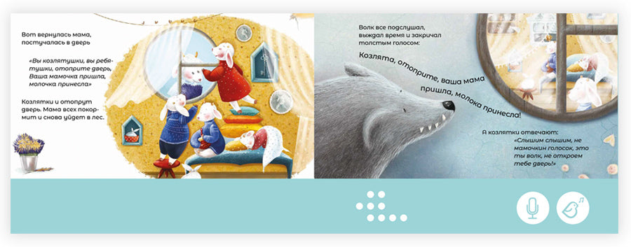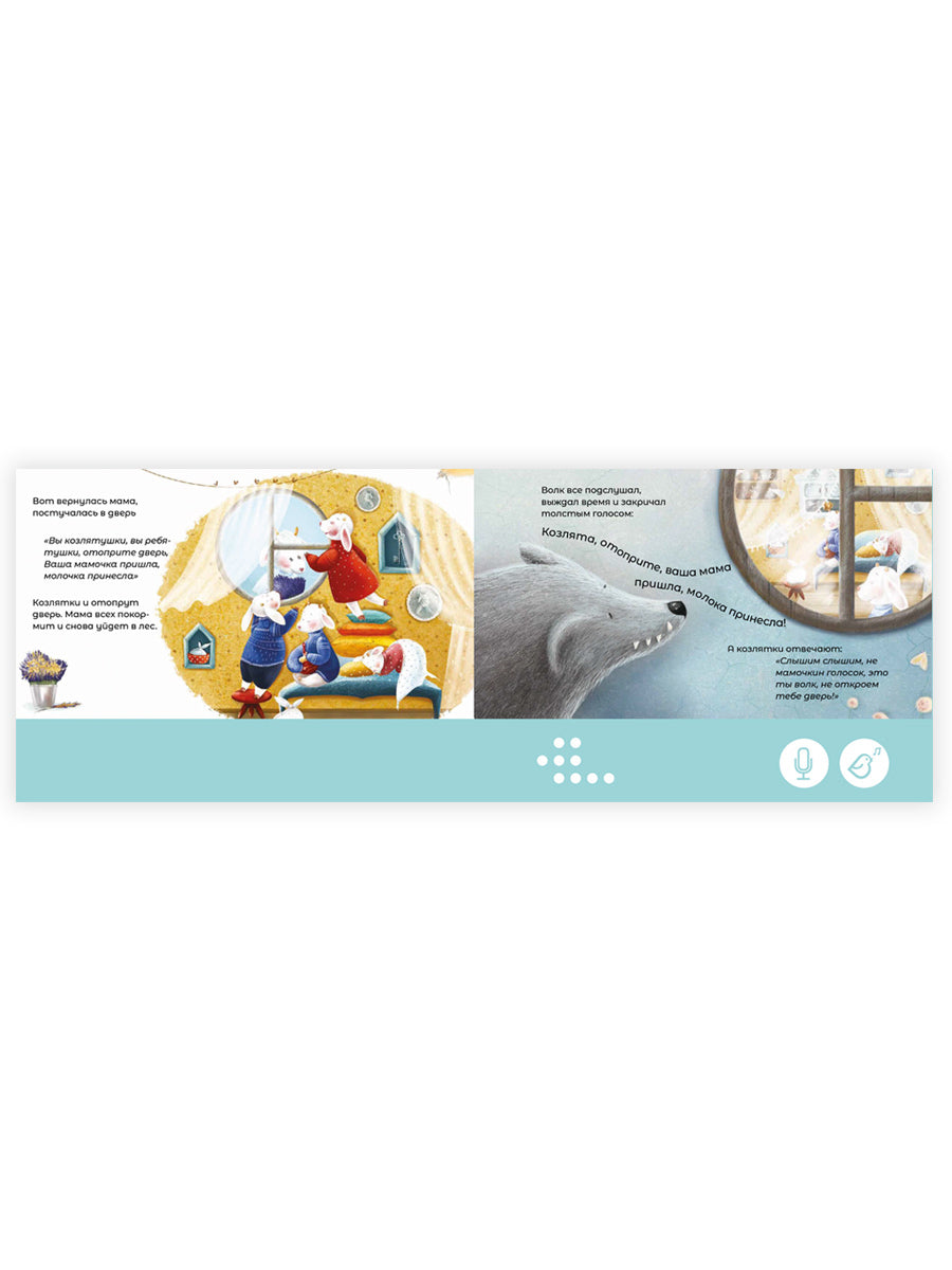 Один из первых и основных продуктов издательства, книга-диктофон «Волк и семеро козлят» теперь доступна в новом, удобном формате. Уменьшенную версию сказки с функцией записи голоса в книгу благодаря встроенному звуковому модулю издательство выпускает впервые. Теперь книгу удобнее взять с собой в дорогу, чтобы еще раз перелистать страницы любимой истории, послушать голос мамы, бабушки, дедушки или других родных, а может быть, и развлечься в путешествии, записав чтение сказки по ролям всей семьей.Книги-диктофоны издательства VoiceBook– это возможность превратить семейное чтение в интерактивный, увлекательный аттракцион, благодаря функции записи в книгу своего голоса. Сказку можно читать по ролям, а можно и просто пересказывать. Ее можно подарить родным или сохранить запись семейного чтения, как доброе воспоминание. Для того, чтобы записать свой голос, достаточно нажать кнопку и начать чтение. Если сделанная запись окажется неудачной, ее можно перезаписать нужное число раз. Специальный тумблер на обороте защитит сделанную запись от случайного стирания, а встроенный датчик распознавания соотнесет записанный голос с нужной страницей книги. Такую сказку мама сможет почитать малышу, даже будучи на работе – достаточно всего лишь открыть книгу.Длительность записи книги 2,5 минуты.