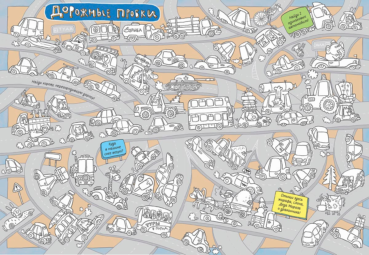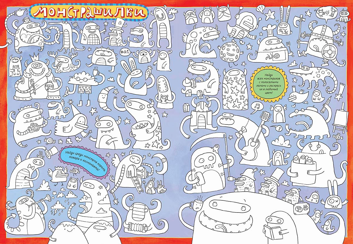 Во-первых, каждый разворот – это целый мир, полный событий. Космос, переполненное шоссе, сказочный лес, старый город, роботы, монстрики, рыцари, мореходы и пираты – всех их нужно раскрасить, на их загадки – ответить, потерявшихся персонажей – найти. А во-вторых, нет, в главных – на каждой странице этой раскраски спрятался очень ловкий и хитрый заяц. Найти его довольно трудно. В конце книги даже есть подсказка для тех, кто так и не обнаружил на страницах раскраски ушастого мастера игры в прятки.