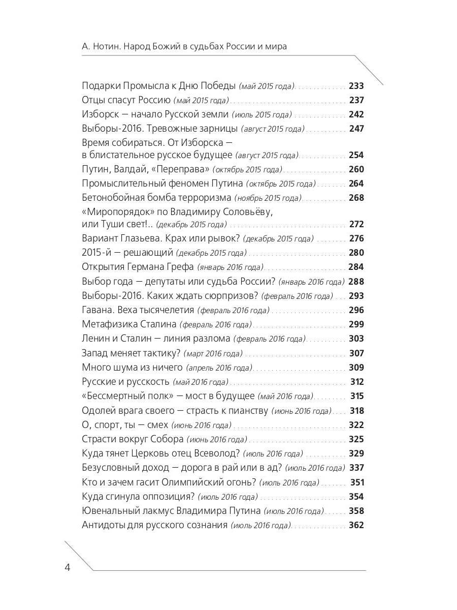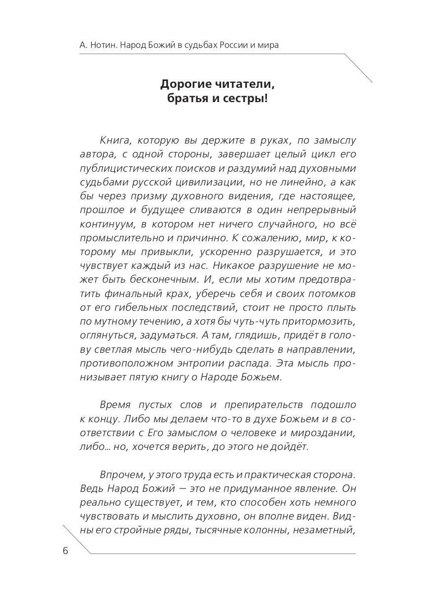 Handling time: 14 days Автор: Нотин Александр, «Народ Божий в судьбах России и мира»: Перед вами — новая книга Александра Ивановича Нотина, руководителя духовно-светского сообщества «Переправа», журналиста, востоковеда, кандидата исторических наук, постоянного члена «Изборского клуба». В последние годы Александр Иванович каждую неделю ведёт диалог с читателями и слушателями на портале «Переправа» и на «Народном радио». За это время было высказано немало сбывшихся прогнозов. Это касается и большой политики, и общественных настроений. Главная тема Александра Нотина — установление связей между общественной жизнью и православной верой на основе святоотеческого наследия. Пожалуй, в этом состоит главная задача, стоящая сегодня перед Россией. Эта книга — пятый по счёту сборник публицистики Александра Нотина, посвященный становлению Народа Божьего — феномена, которому суждено сыграть решающую роль в русском будущем. Это разговор по душам - о самом сокровенном и главном. О русском будущем, достойном предназначения православного народа. Часть материалов является оперативными отзывами автора на события российской и международной политической жизни. Приглядитесь к датам публикаций — и вы заметите, что во многом Нотину удалось предсказать ход событий в Сирии, в Турции... Объединяет книгу надежда Александра Нотина на то, что духовно-светский путь станет спасительным для планеты под названием Русь. Да будет так!
