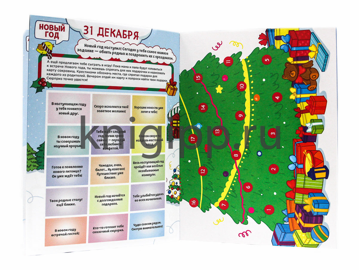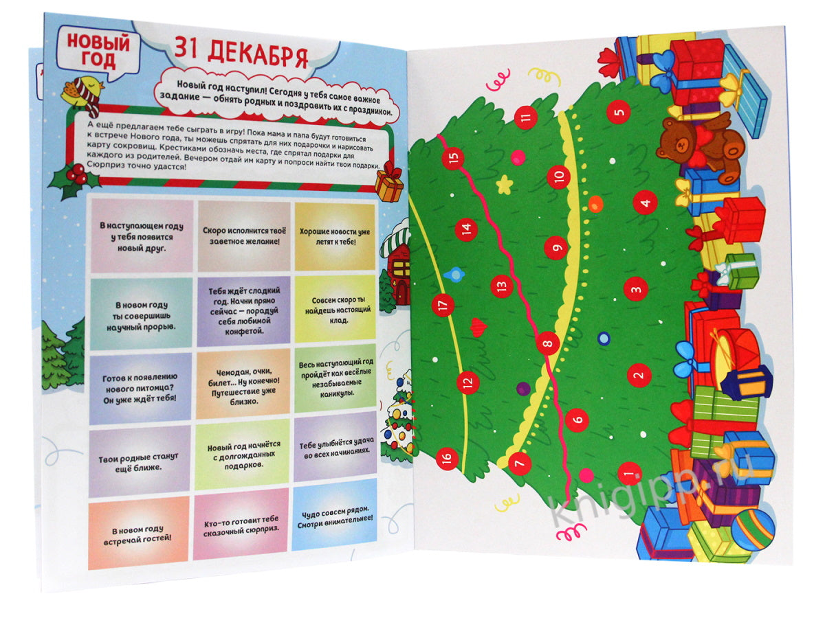 Handling time: 30 days Новогодний адвент-календарь подарит каждому ребёнку настроение наступающего праздника. В нём собраны игры, увлекательные задания, ребусы, поделки на каждый день до наступления Нового года. С ними ждать праздника - гораздо веселее и интереснее! Внутри адвент-календаря найдутся красочные наклейки в виде ёлочных игрушек и плакат в виде ёлки, которую можно заполнить этими игрушками. Повесьте его на стену и украшайте вместе с ребёнком по мере приближения 31 декабря.Для чтения взрослыми детям.