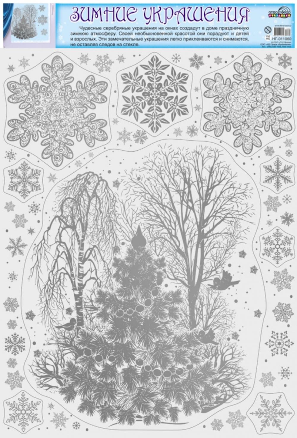 *НГ-11060 Зимние украшения на окна В ПАКЕТЕ. Зимний пейзаж (серебряная голография, многоразовые, видны с обеих сторон, в индивидуальном пакете, с европодвесом и клеевым клапаном)