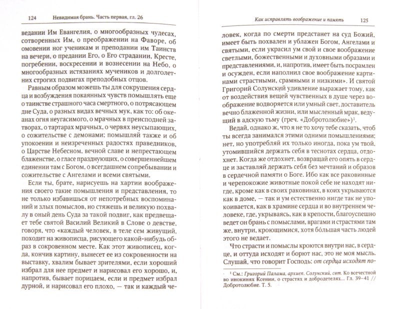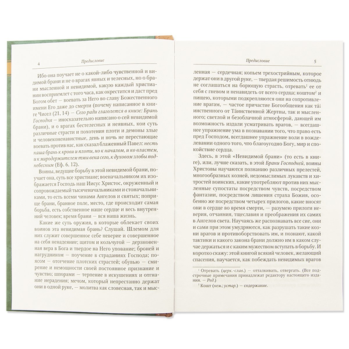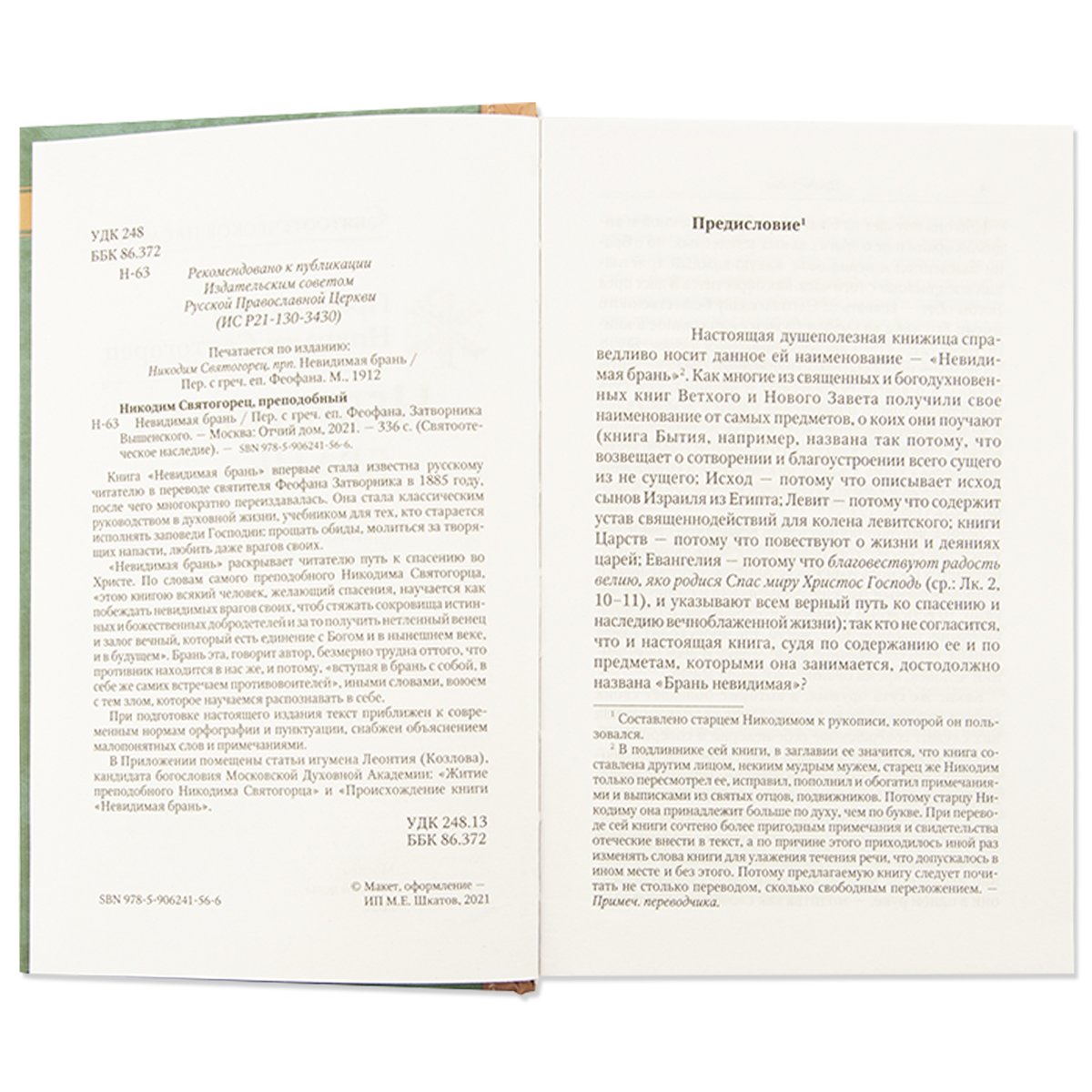 Книга "Невидимая брань" впервые стала известна русскому читателю в переводе святителя Феофана Затворника в 1885 году, после чего многократно переиздавалась. Она стала классическим руководством в духовной жизни, учебником для тех, кто старается исполнять заповеди Господни: прощать обиды, молиться за творящих напасти, любить даже врагов своих."Невидимая брань" раскрывает читателю путь к спасению во Христе. По словам самого преподобного Никодима Святогорца,"этою книгою всякий человек, желающий спасения, научается как побеждать невидимых врагов своих, чтоб стяжать сокровища истинных и божественных добродетелей и за то получить нетленный венец и залог вечный, который есть единение с Богом и в нынешнем веке, и в будущем". Брань эта, говорит автор, безмерно трудна оттого, что противник находится в нас же, и потому, "вступая в брань с собой, в себе же самих встречаем противовоителей", иными словами, воюем с тем злом, которое научаемся распознавать в себе. При подготовке настоящего издания текст приближен к современным нормам орфографии и пунктуации, снабжен объяснением малопонятных слов и примечаниями.В Приложении помещены статьи игумена Леонтия Козлова, кандидата богословия Московской Духовной Академии: "Житие преподобного Никодима Святогорца" и "Происхождение книги "Невидимая брань".Рекомендовано к публикации Издательским Советом РПЦ ИС Р21-130-3430.