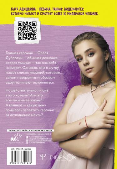 Главная героиня - Олеся Дубрович - обычная девчонка, "серая мышка" - так она себя называет. Однажды Олеся в шутку пишет список желаний, которые… самым невероятным образом вдруг начинают исполняться.Сперва она становится мега-популярным блогером, затем в нее влюбляется самый красивый мальчик в школе, после…Но действительно ли она этого хотела? Или это все-таки не ее жизнь? А главное - какую цену пришлось заплатить героине за исполнение мечты?Ответы на сотни подростковых вопросов об отношениях с родителями и сверстниками, о поиске себя и своего призвания, о правильной расстановке приоритетов, о первой любви и предательстве. Пять причин купить 1Катя Адушкина — певица, танцор, видеоблогер с аудиторией более 10 миллионов человек. 2Откровения Олеси Дубрович — обычной девочки-подростка, которая стала популярным блогером. 3История о том, как не потерять себя в погоне за сокровенной мечтой. 4Ответы на самые важные подростковые вопросы: семья, школа, любовь, карьера. 5Книга для тех, кто находится в поиске себя и своего настоящего призвания.