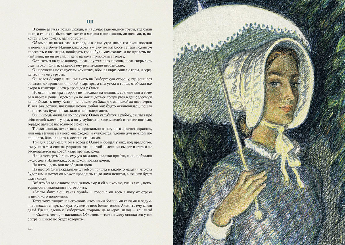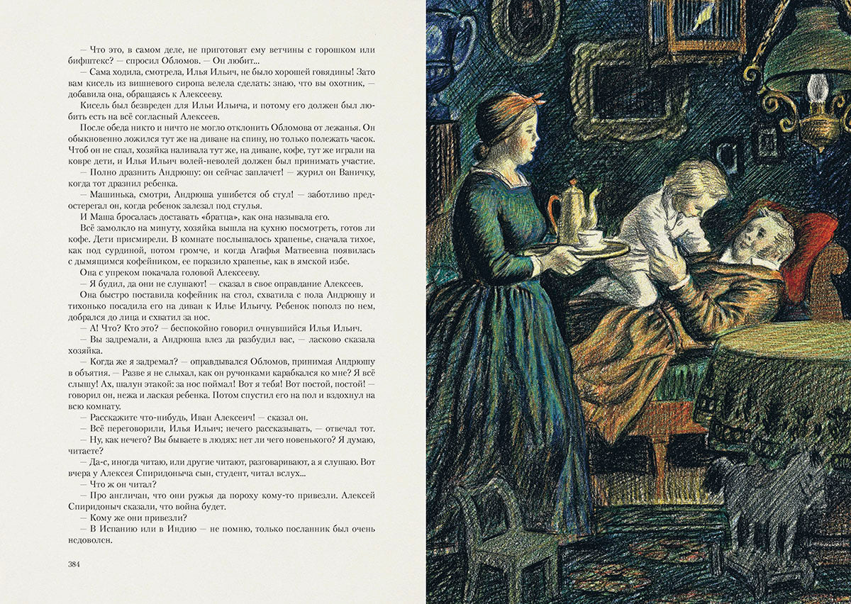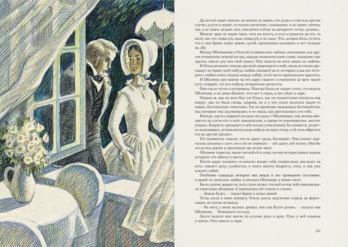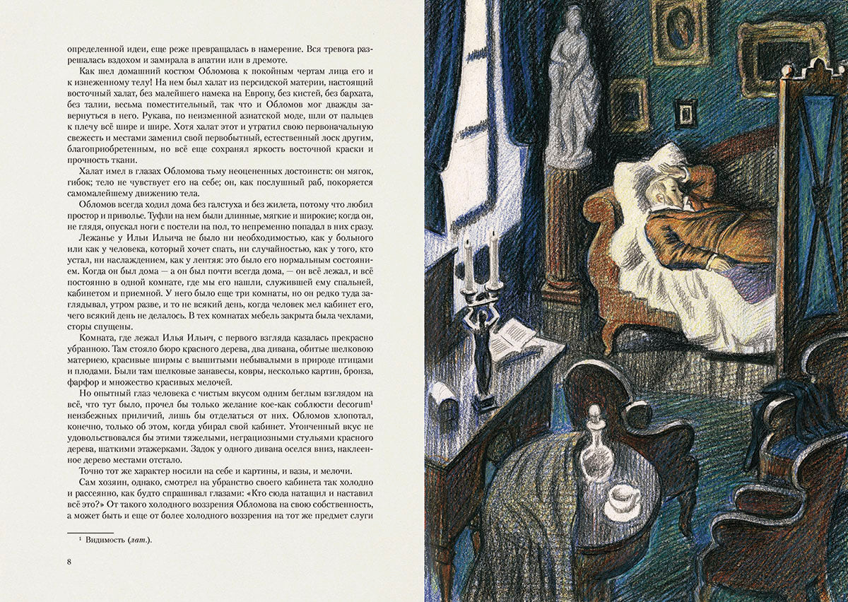 Handling time: 19 days «Обломовщина!» — в сердцах говорит Андрей Штольц своему другу, Илье Ильичу Обломову. И ведь хороший человек Илья Ильич, никого зря не обидит, напротив, всем прощает мелкий обман и жажду нажиться на себе, лежит на диване, в большие дела не влезает, значительных планов не имеет. Ему комфортно. А «обломовщина» звучит даже презрительно. Энергичный и предприимчивый Штольц пытается расшевелить своего товарища, но обломовское представление о комфорте вступает в противоречие с реальностью. Многоплановый художник Юрий Гершкович для иллюстраций к «Обломову» выбрал стиль мягкий, округлый, словно бы сам Илья Ильич, не вставая с дивана, выпростал руку из шелкового халата да изобразил себя и всех вокруг. Портрет И. А. Гончарова на фронтисписе: П. Ф. Борель, литография, 1869 Текст печатается по изданию: Гончаров И. А. Полн. собр. соч. : в 20 т. СПб. : Наука, 1998. Т. 4. Комментарии А. Г. Гродецкой