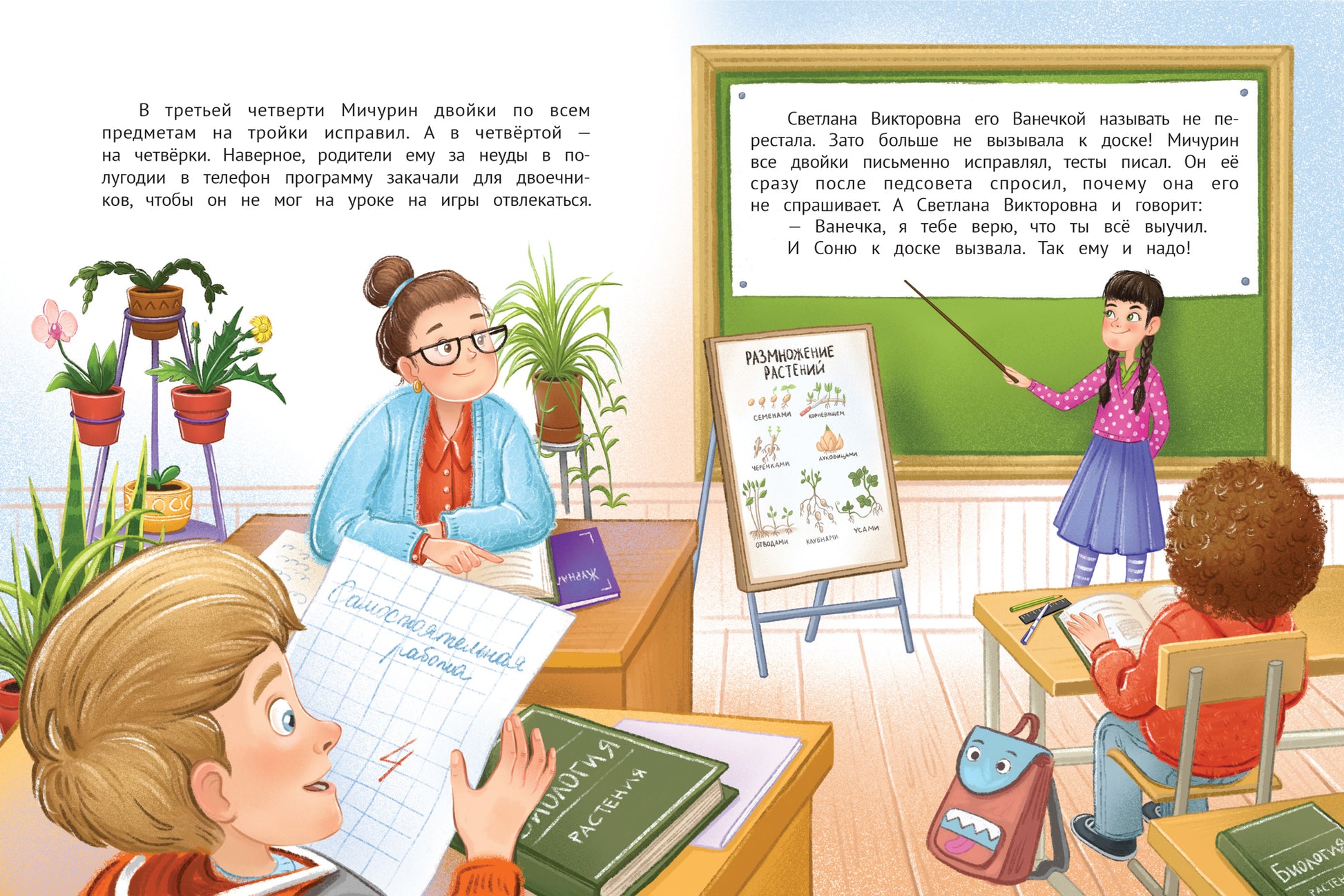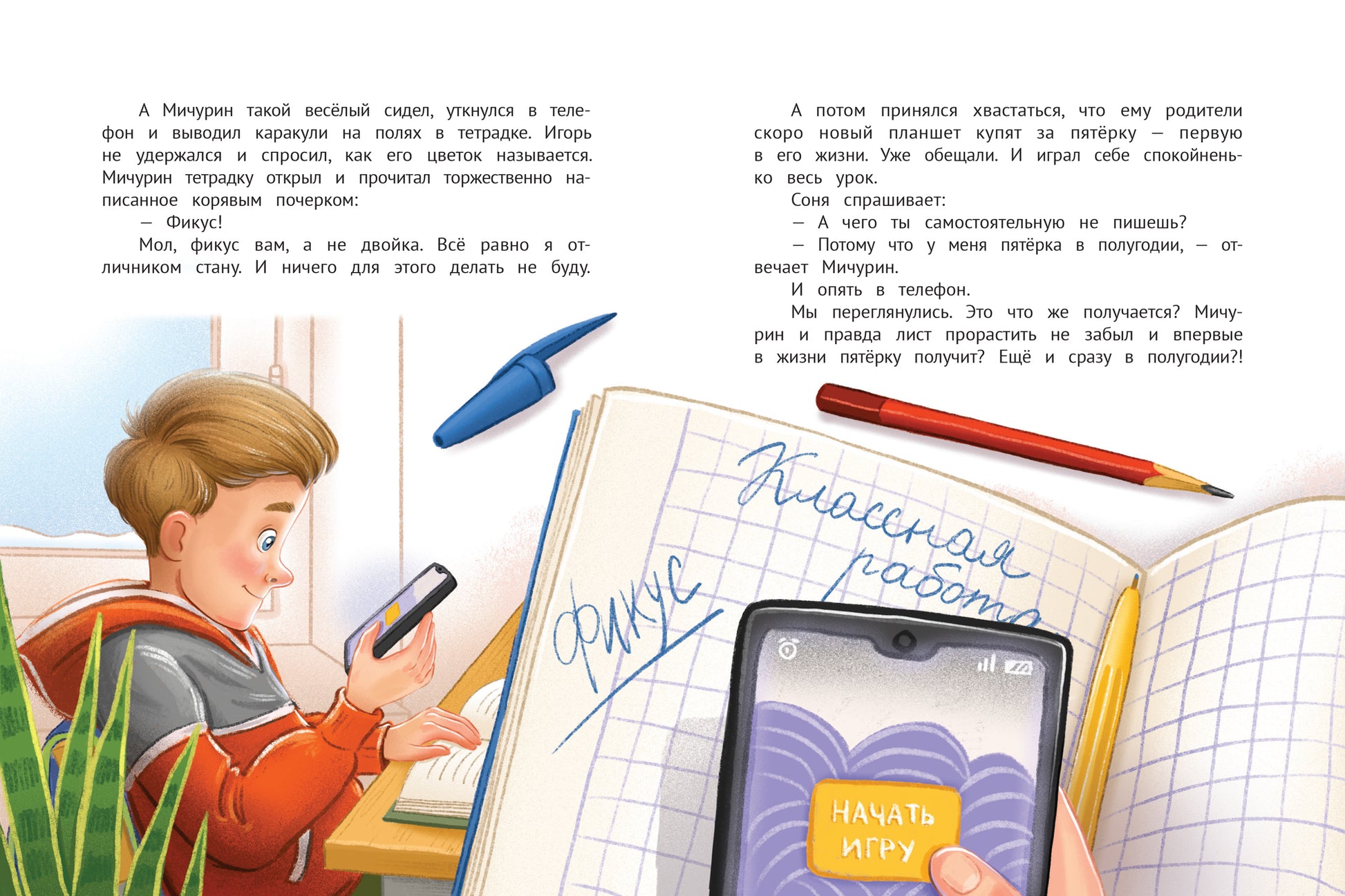 Пятиклассник Ванечка Мичурин любит на уроках играть на телефоне, но и пятёрку в полугодии ему тоже хочется получить. Благодаря заданию учительницы у него появляется возможность исправить двойку на пятёрку. И кажется, будто хитрый план сработал, пятёрка уже почти в дневнике, что может пойти не так? Самое время открыть книжку и узнать! Эту озорную и поучительную историю придумала Ирина Данилова - победитель литературного конкурса "Корнейчуковская премия" в 2020 году.