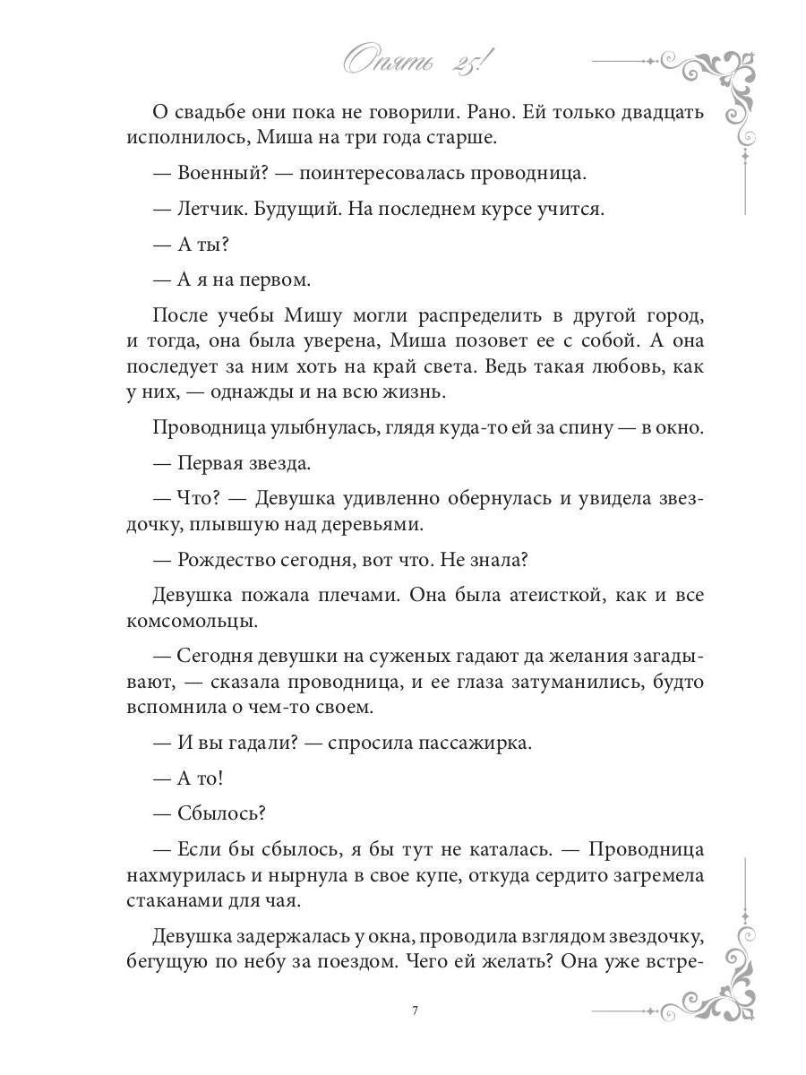 Handling time: 19 days Автор: Набокова Юлия, «Опять 25!»: Жизнерадостная и молодая душой 75-летняя Аполлинария загадывает желание на Рождество и становится 25-летней. Она бросает все силы на поиски лучшего жениха для своей 25-летней внучки, встречает парня, как две капли воды, похожего на ее первую любовь, и, пустившись в расследование, выясняет неожиданную правду о своем прошлом. Но сможет ли она избежать опасности в лице заклятой подруги-колдуньи и светской львицы, одержимой поисками эликсира молодости? Ведь Аполлинария — единственная, кому удалось обмануть время и снова стать молодой.