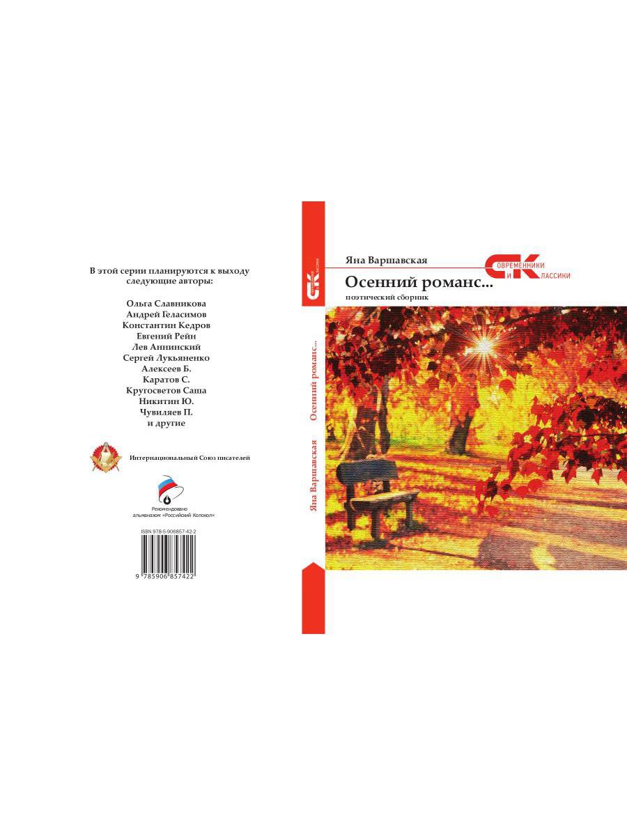 Handling time: 14 days Автор: Варшавская Я., «Осенний романс...»: Поэзия Яны Варшавской окутывает душу лёгкой воздушной дымкой. Её стихи похожи на светлые пастельные рисунки. Нежные краски, тонкие чувства, мудрость и ранимость женщины-Осени — это Яна Варшавская...