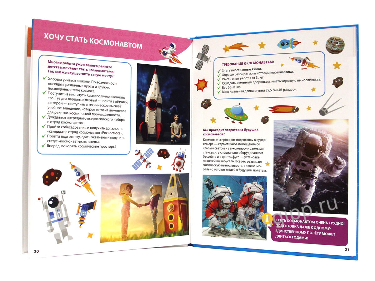 Перед вами яркая, увлекательная, познавательная книга. Раскрыв её, малыш познакомится с устройством Солнечной системы, узнает, в чём заключаются особенности планет и различных космических явлений, откроет для себя удивительную профессию космонавта.А ещё энциклопедия ответит на множество вопросов, волнующих каждого ребёнка: почему происходят солнечные затмения, что такое атмосфера, сколько длятся сутки на Луне, откуда у кометы хвост, как происходит подготовка будущих космонавтов, что такое невесомость, откуда берётся мусор в космосе и многие другие.Длоя чтения взрослыми детям.
