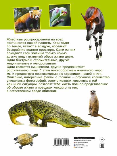 Везде на территории нашей планеты - от раскаленных песков жарких пустынь до закованных во льды полюсов - можно встретить животных. Многие тебе уже, конечно, знакомы: и волк, и лев, и даже азиатский мишка панда, но о некоторых скорее всего, даже не доводилось и слышать. Познакомиться со всем многообразием фауны тебе поможет эта книга. На ее страницах приведены очень интересные статьи, описывающие образ жизни и повадки разных зверей и птиц, но главное - здесь есть большое количество фотографий, благодаря которым ты сможешь рассмотреть во всех подробностях каждое животное в естественной среде обитания.Рассматривай красочные фотографий, читай справочную информацию и увлекательные факты и знакомься ближе с животными миром нашей планеты!Для среднего школьного возраста.