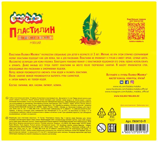 Пластилин для детского творчества Каляка-Маляка® - это улучшенная формула классического пластилина. Благодаря повышенному содержанию воска, маленькие любители творчества без труда смогут смять брусок и придать ему нужную форму.Имеет яркие сочные цвета, мягко растягивается и не рвется, прекрасно держит форму. При этом не окрашивает руки, не прилипает и не оставляет масляных пятен. Изготавливается на современном российском производстве, соответствует всем стандартам безопасности детской продукции.- Пластилин для детского творчества может применяться для творчества детей, начиная от трех лет.- Развивает мелкую моторику рук и творческое мышление у детей.- Прекрасно подходит как для создания фигур, так и для рисования пластилином.- Рекомендуется и для домашних поделок, для уроков труда в школе и занятий творчеством в детском саду.В наборе пластилин десяти цветов с удобным пластиковым стеком.Состав: парафин, мел, каолин, пигмент, белила.Сделано в России.
