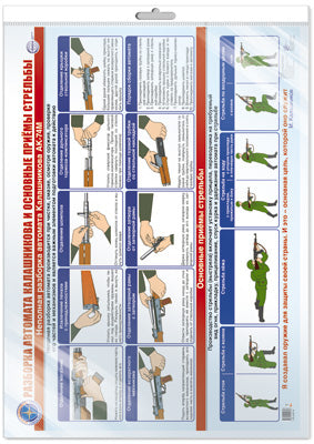 Плакат посвящен правилам обращения с автоматом Калашникова и приемам стрельбы из него. В разделе «Неполная разборка автомата» приводится алгоритм действий по разборке автомата, которая необходима при чистке, смазке и осмотре оружия, а также порядок действий при сборке автомата. В разделе «Основные приемы стрельбы» демонстрируются навыки обращения с автоматом во время ведения огня в разном положении — стоя, с колена, лежа, на ходу и т.д. Плакат прекрасно иллюстрирован, имеет удобный формат А2, что позволяет изучать тему как индивидуально, так и на групповых занятиях в образовательных организациях.