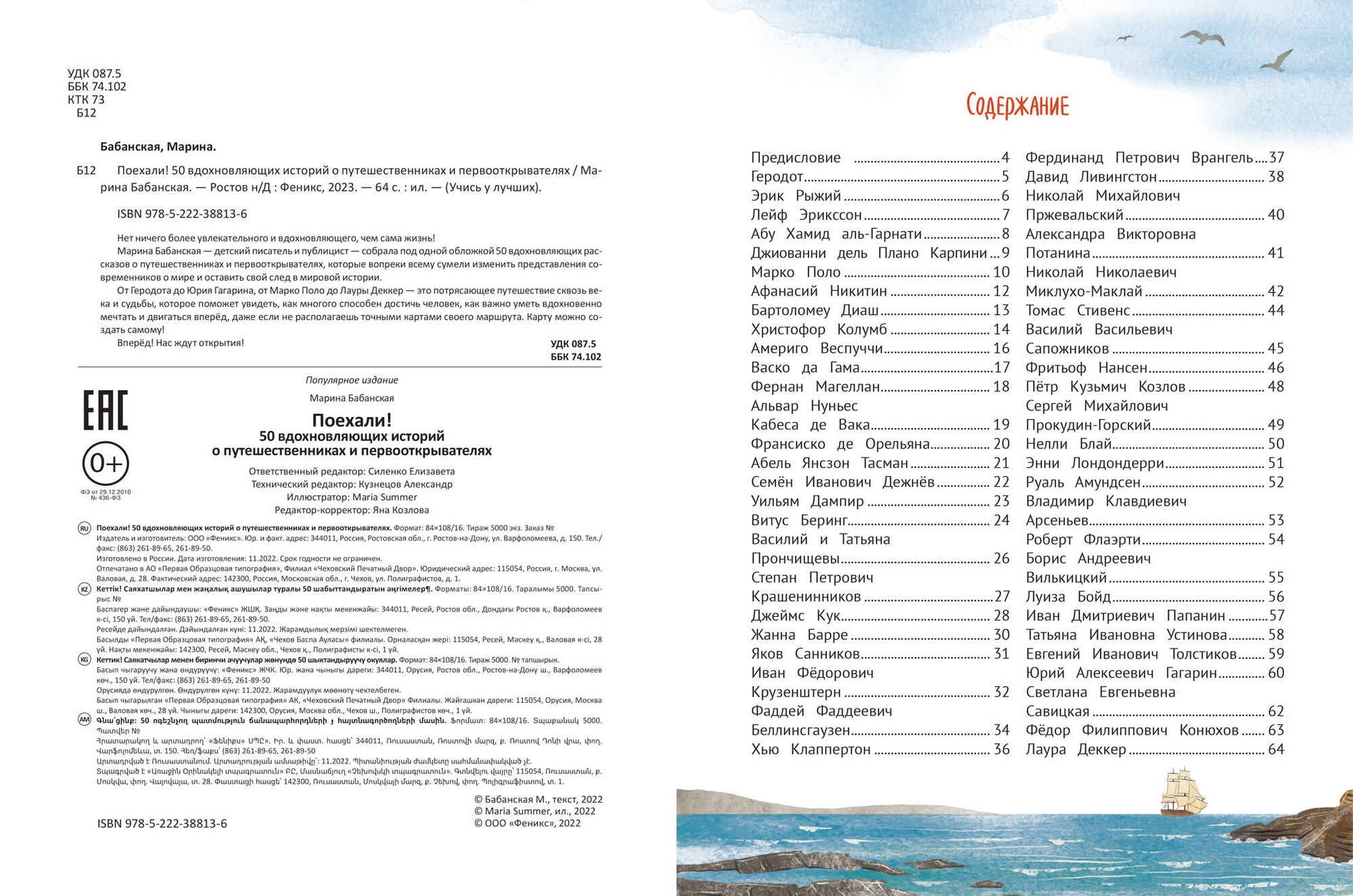 Нет ничего более увлекательного и вдохновляющего, чем сама жизнь!Марина Бабанская - детский писатель и публицист - собрала под одной обложкой 50 вдохновляющих рассказов о путешественниках и первооткрывателях, которые вопреки всему сумели изменить представления современников о мире и оставить свой след в мировой истории.От Геродота до Юрия Гагарина, от Марко Поло до Лауры Деккер - это потрясающее путешествие сквозь века и судьбы, которое поможет увидеть, как многого способен достичь человек, как важно уметь вдохновенно мечтать и двигаться вперёд, даже если не располагаешь точными картами своего маршрута. Карту можно создать самому!Вперёд! Нас ждут открытия!